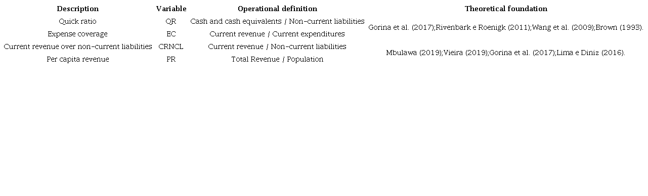The dependent variable in the study is the financial condition of the municipalities under analysis. The study has a limitation that consists in the short-term indicators proposed in the study of Vieira (2019), as detailed in Table 1.