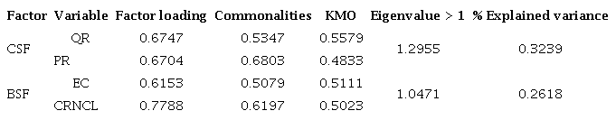 Once the criteria for factor analysis were met, factors generated through principal component analysis were extracted (Hair et al., 2009). From the factor analysis, 2 (two) factors were generated based on the indicators representing financial condition: Cash Solvency Factor (CSF) and Budgetary Solvency Factor (BSF), according to Table 4.