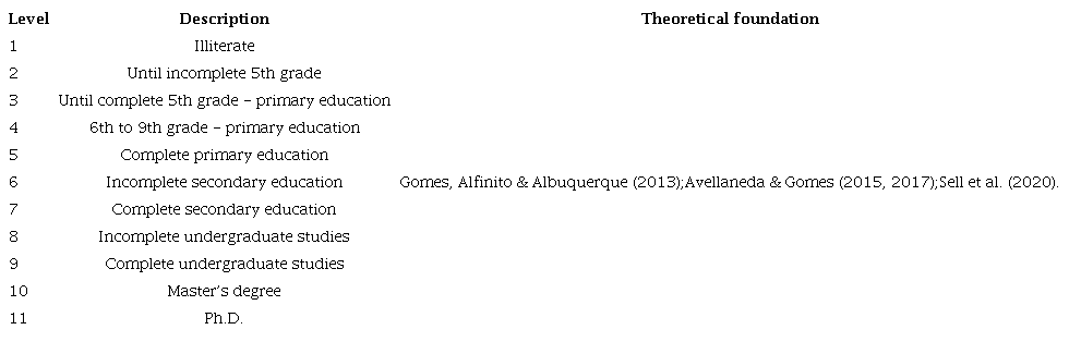 The independent variables represent the managerial capacity. It is worth stressing that the explanatory variable (education level) was collected, adapted and measured according to the education level proposed by the manual for Brazilian employers’ RAIS form on labor and employment information. According to this manual, the education level classification ranges from “illiterate” to “Ph.D.”, comprising 11 education level tiers as shown in Table 6.