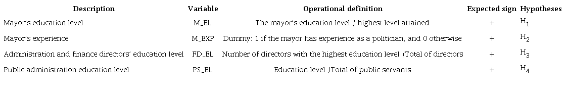 It is understood that managerial capacity can assist the decision making process in addressing problems and opportunities assertively (Rougoor et al., 1998). The measures that are most often used to measure managerial capacity are related with personal characteristics (age, education level and experience in the activity). Therefore, in this study, the proxy for managerial capacity is the mayor’s human capital, encompassing their education and experience related to the occupation.