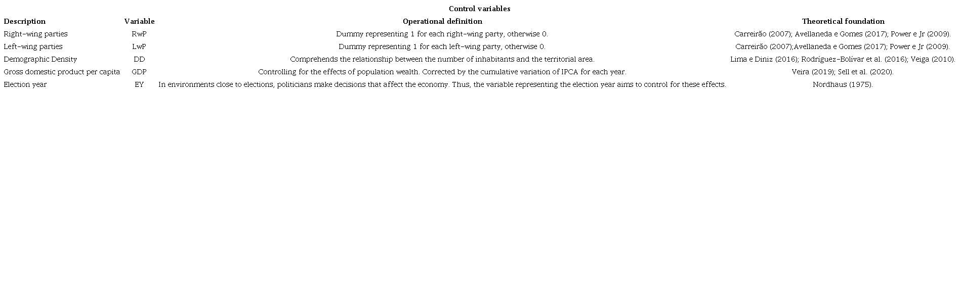 The data used in the analysis were collected from the databases of the National Treasury Secretariat, the Superior Electoral Court, the Brazilian Institute of Geography and Statistics, and the Ministry of Labor and Employment.