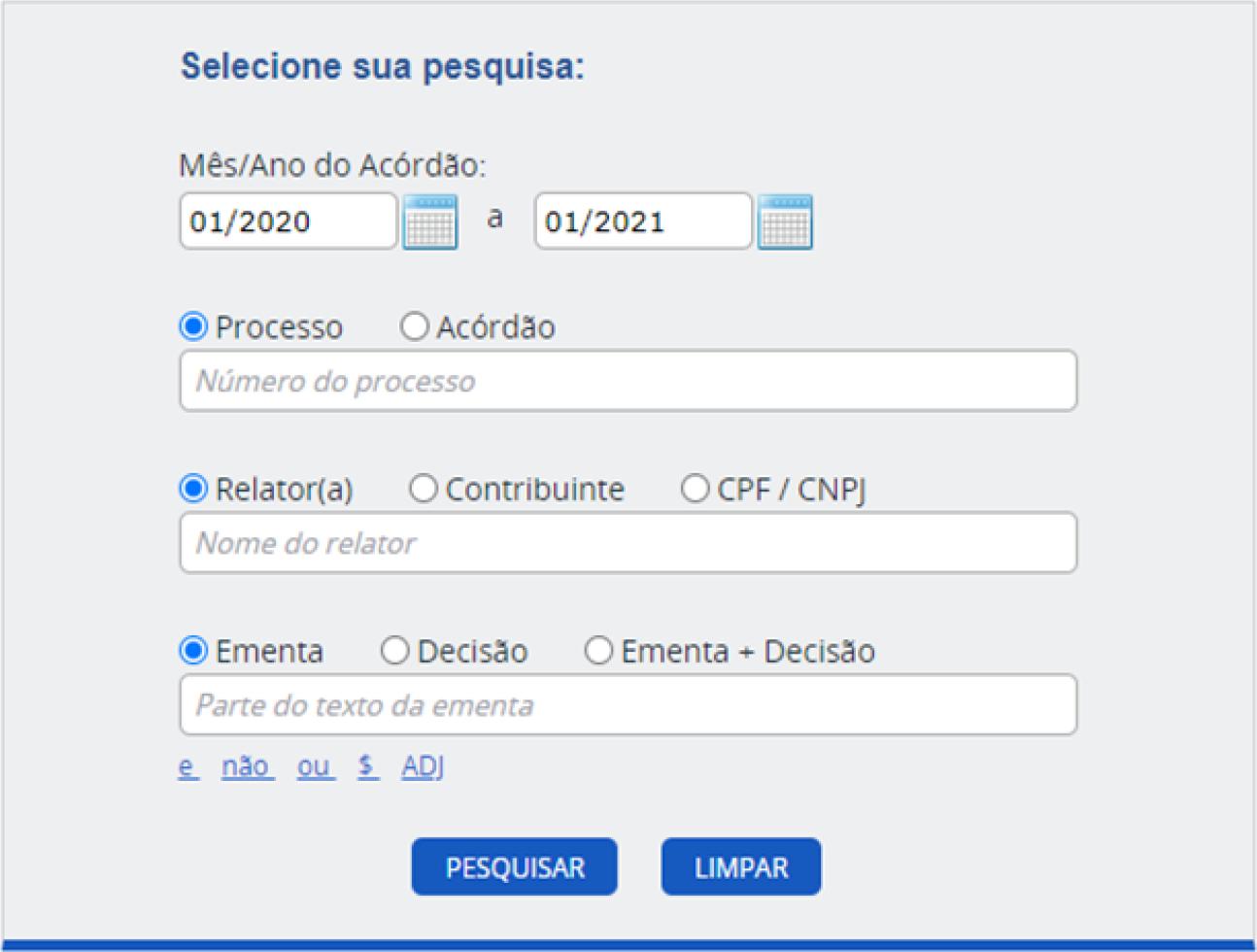 CARF judgments data was retrieved directly from the Administrative Council’s search page1. The search engine allows retrieving data by the case or judgment number, by the rapporteur’s name, the taxpayer’s name or tax identification number (CPF for individuals and CNPJ for companies), or keywords found in the judgment summary or in the full text of the decision. Data collection was performed using Python’s Selenium library and ChromeDrive implementation2. XPATH was used to access the content of the pages. The CARF page has the following configuration: