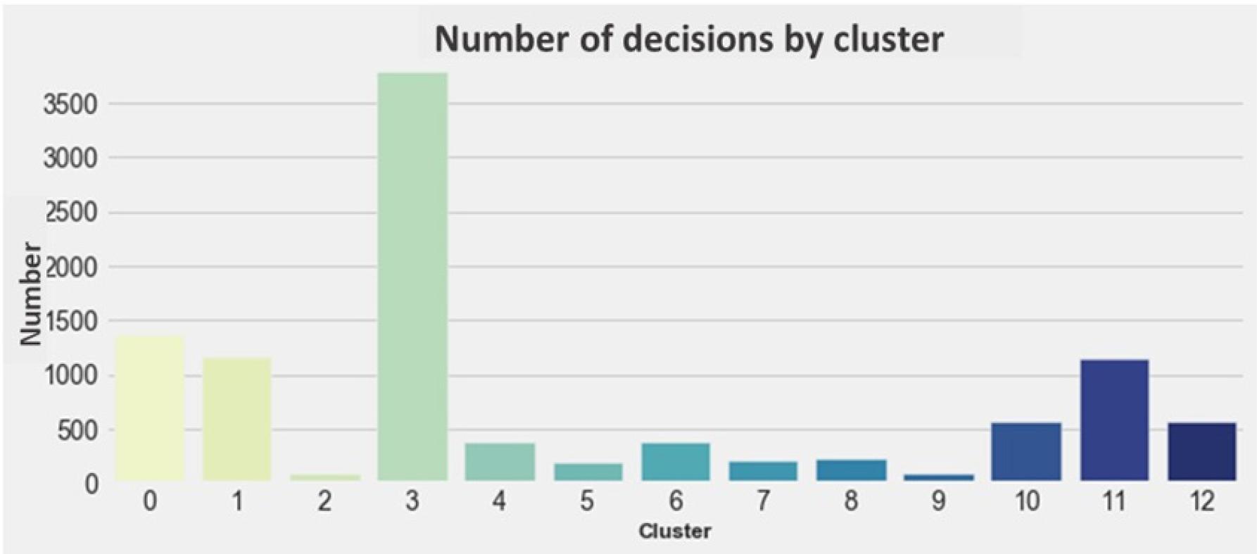 Despite its virtues, this research has some limitations, such as the difficulties in data collection and the need to adapt notebooks to perform it without interruptions - aspects that can be addressed in future works. Another limitation was the concentration of many decisions in a single group (cluster 3), making it difficult to define the main subject addressed. Future research can address this difficulty by exploring the nature of the financial entries included in this cluster.