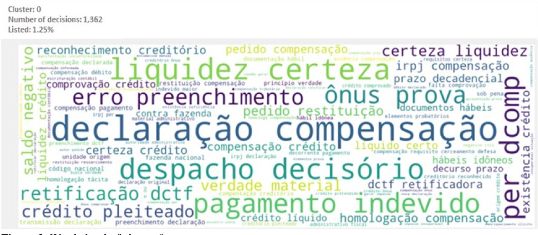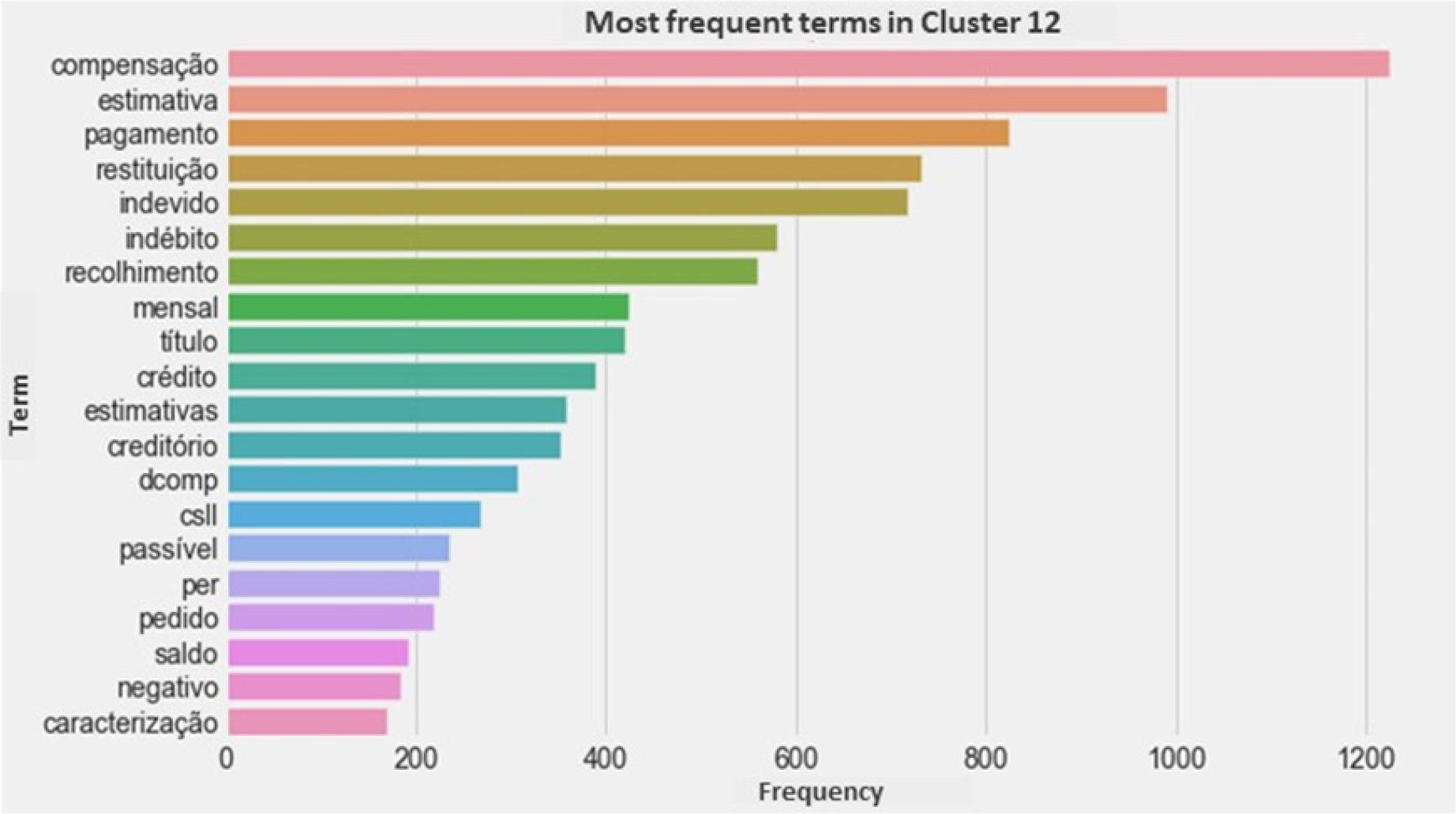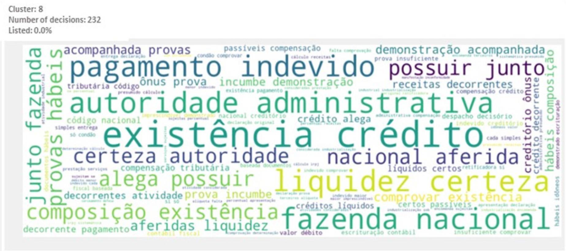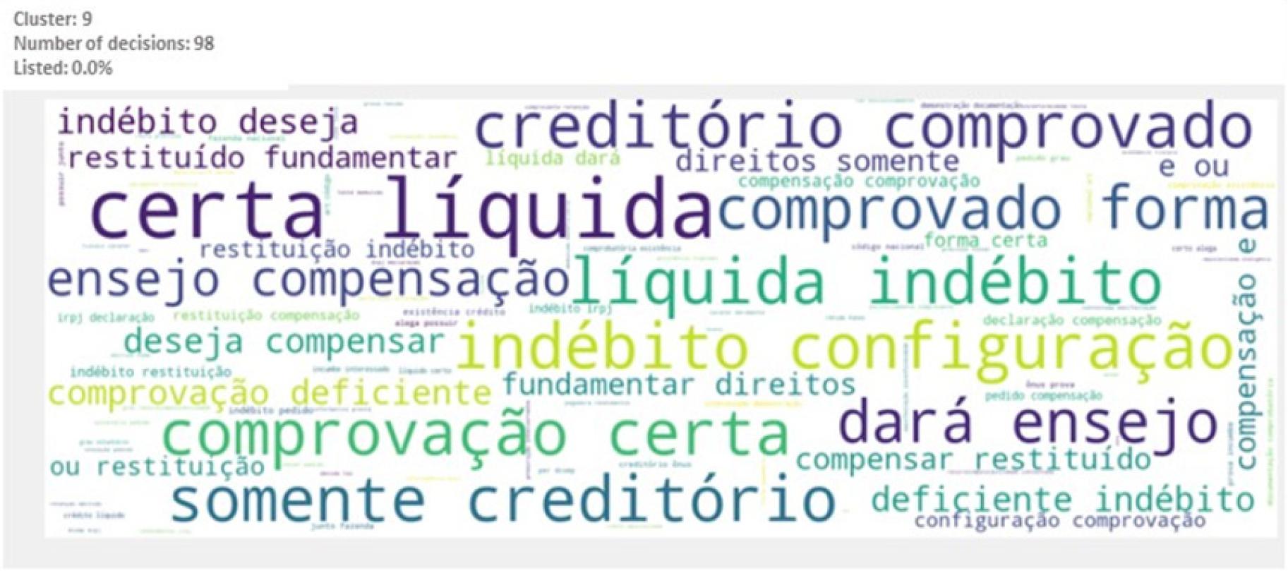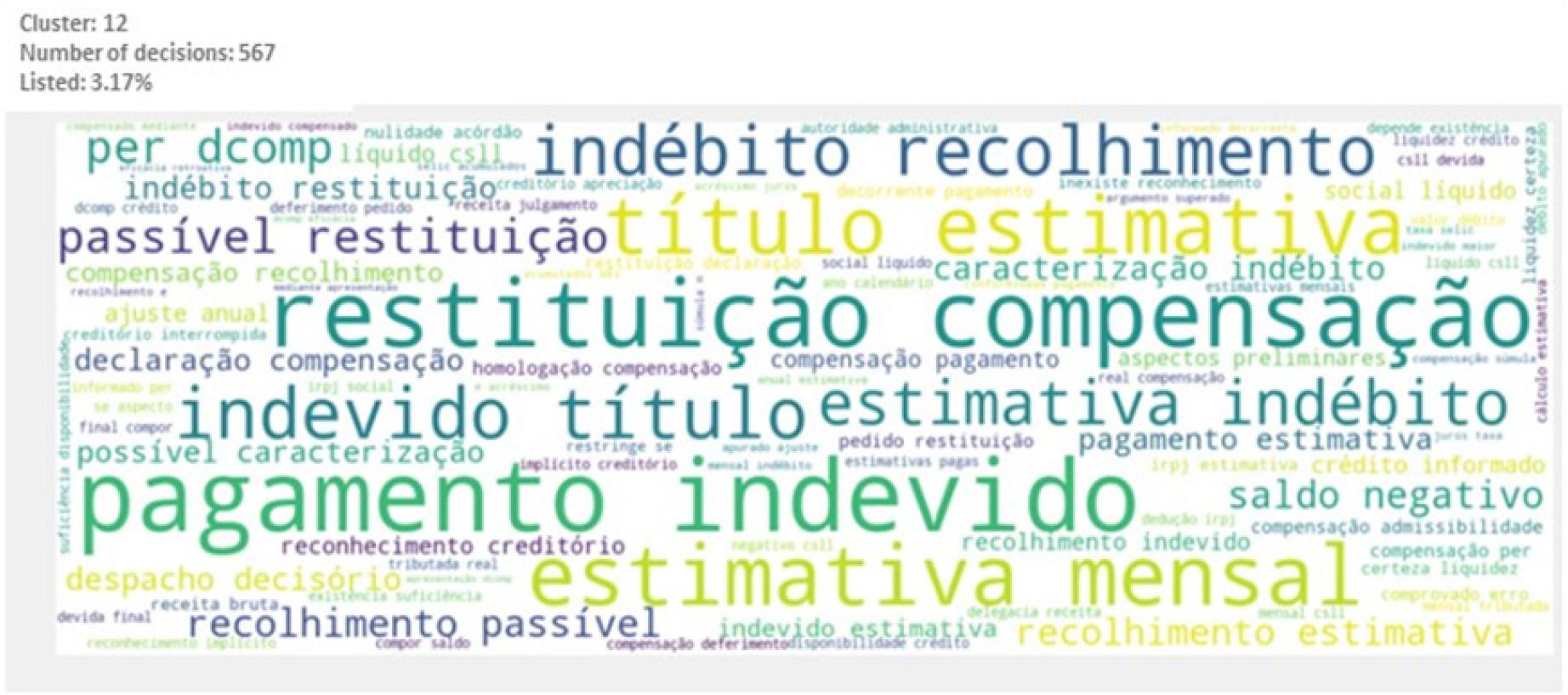 Main words or expressions that characterize the cluster: “pagamento indevido”, “compensação”, “restituição”, “estimativa”, “pagamento”, “indevido”, “indébito”, “crédito”, “DCOMP”, “PER”, “recolhimento”, “saldo negativo” (undue payment, offset, refund, estimate, payment, undue, indebt, credit, compensation declaration, electronic request of refund, collection, negative balance).