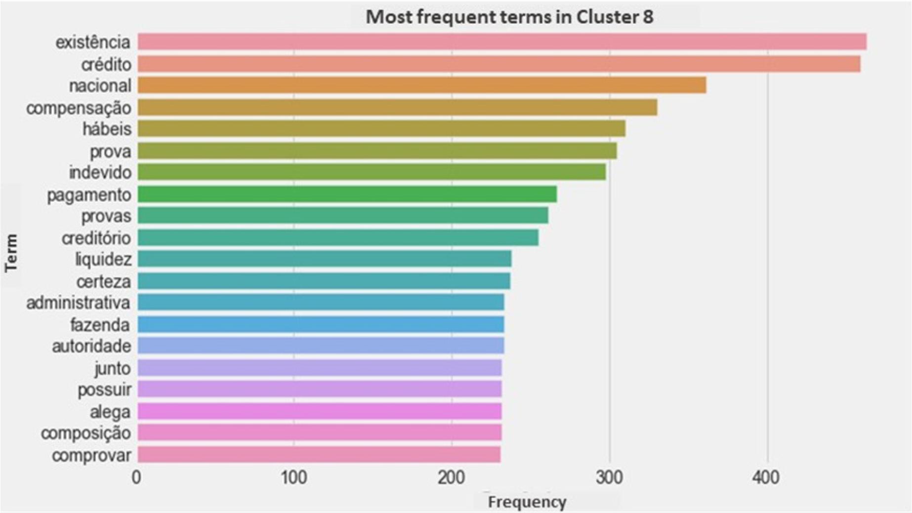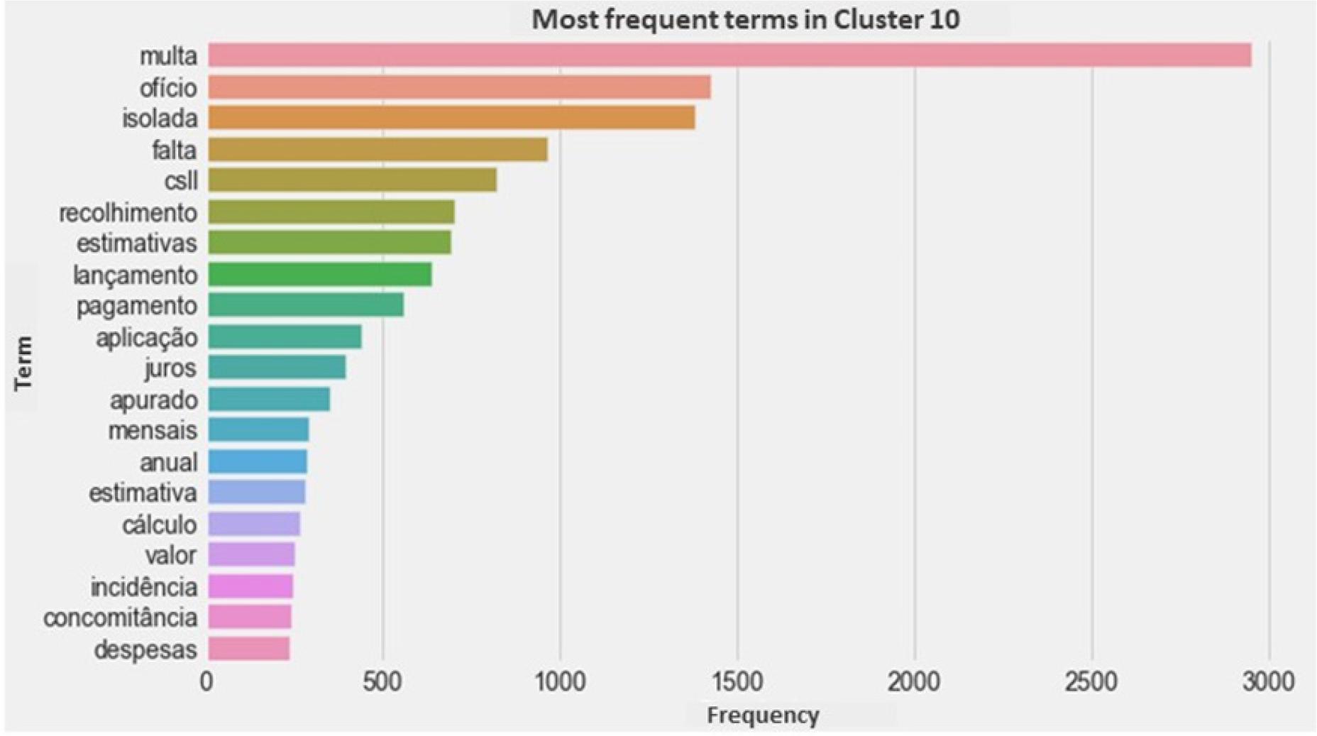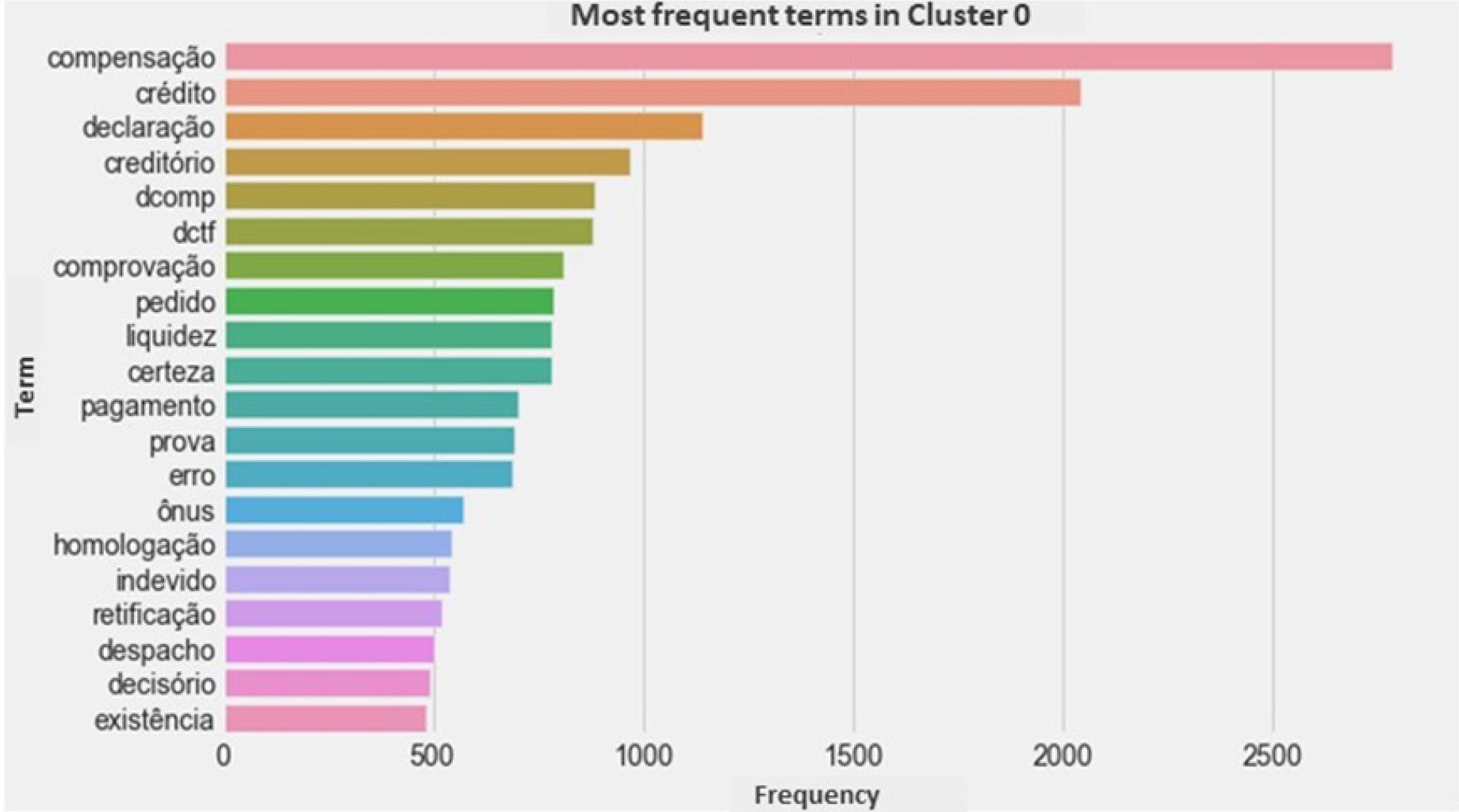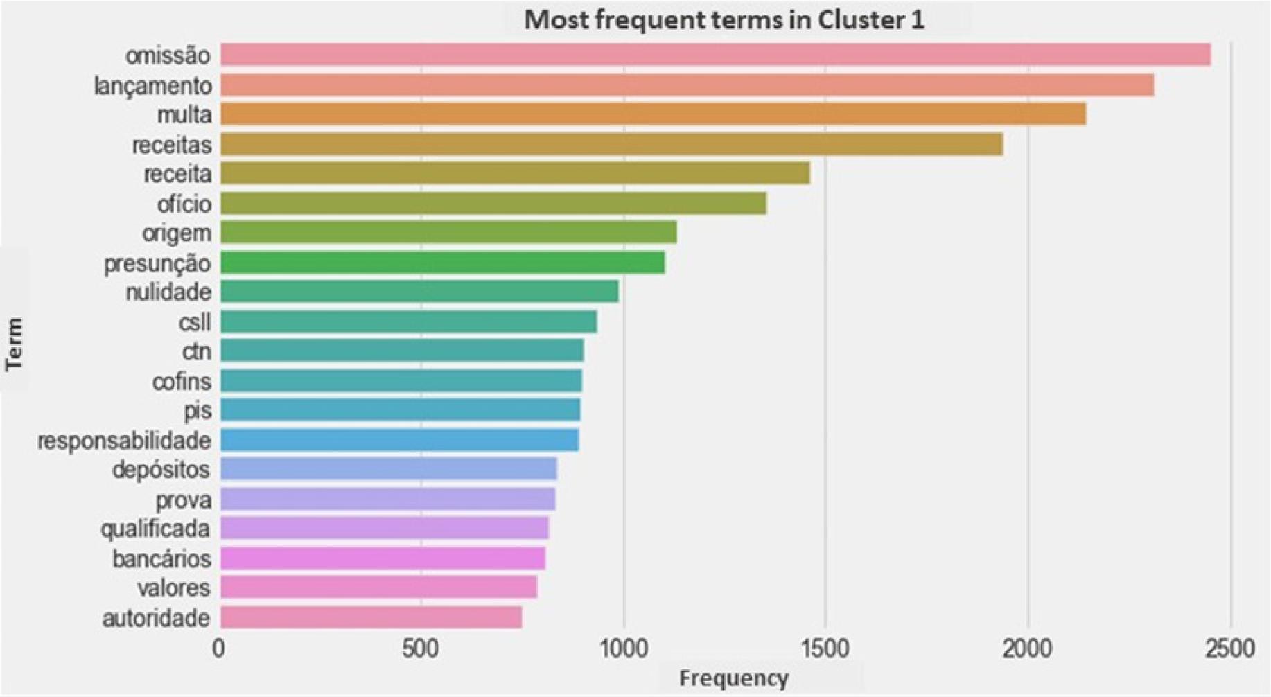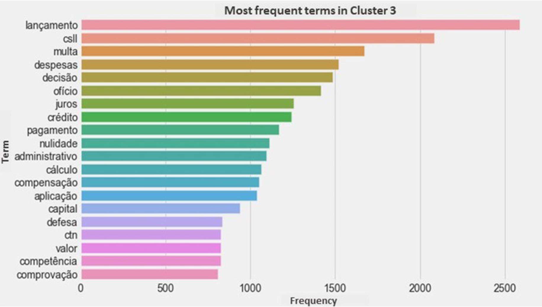 The analysis of the terms extracted from the summaries revealed the roots of the words “compensação” (offset), “multa” (fine), “receita” (revenue), “provisão” (provision), “despesa” (expense), “estimativa” (estimate), and “omissão” (omission), among others. Such words provide a first insight into the issues most addressed in the judgments. Some words (or rather, their roots) draw attention: “ágio” (premium), “creditório” (creditor-related), “decadência” (expiration), “homologação” (approval), “DCOMP” (compensation declaration), “origem” (origin), among others. These roots also indicate the issues most analyzed by CARF for IRPJ.