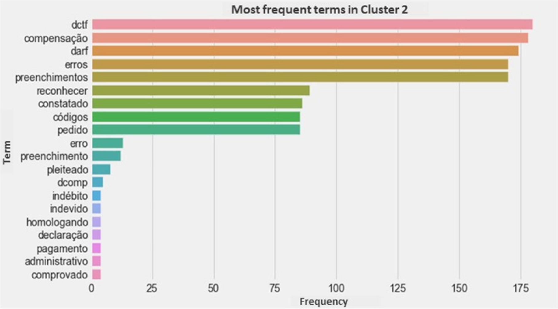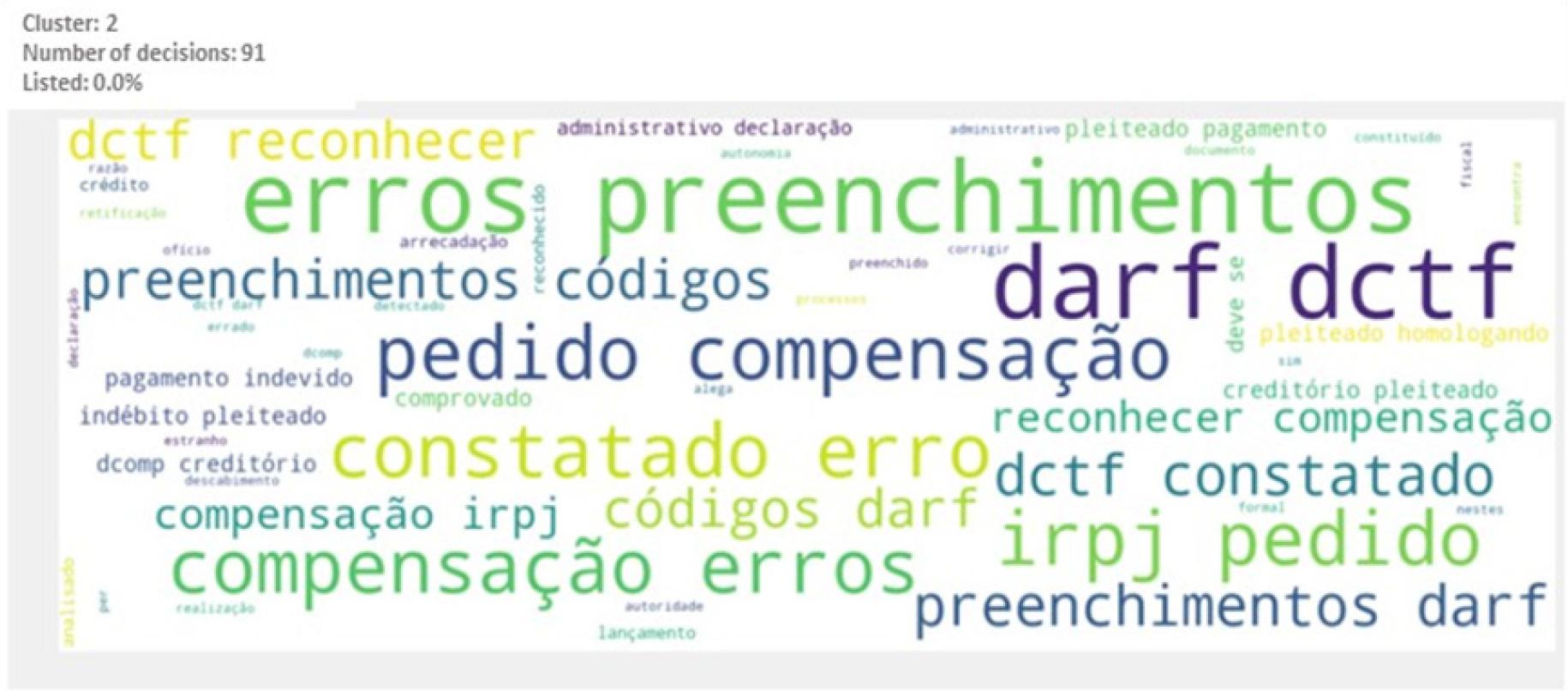 Main words or expressions that characterize the cluster: “DARF”, “DCTF”, “compensação”, “erro”, “erros”, “preenchimentos”, “códigos”, “pedido”, “reconhecer”, “indébito” (DARF, DCTF, offset, error, errors, completions, codes, request, acknowledge, indebt).