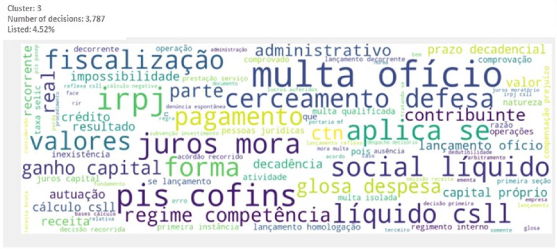Additionally, cluster 3 contains significantly more observations than the other clusters. The concentration of cases in this cluster can be explained by the nature of ex-officio entries related to IRPJ, which also encompass other taxes such as PIS/COFINS and CSLL. While the judgments in this cluster share a factual basis related to IRPJ assessments, the specific aspects of PIS/COFINS and CSLL legislation are also considered. Cluster 5, on the other hand, addresses controversies regarding PIS/PASEP and COFINS credits, where the concept of input and production is highly debated, indicating recurring issues in CARF judgments.