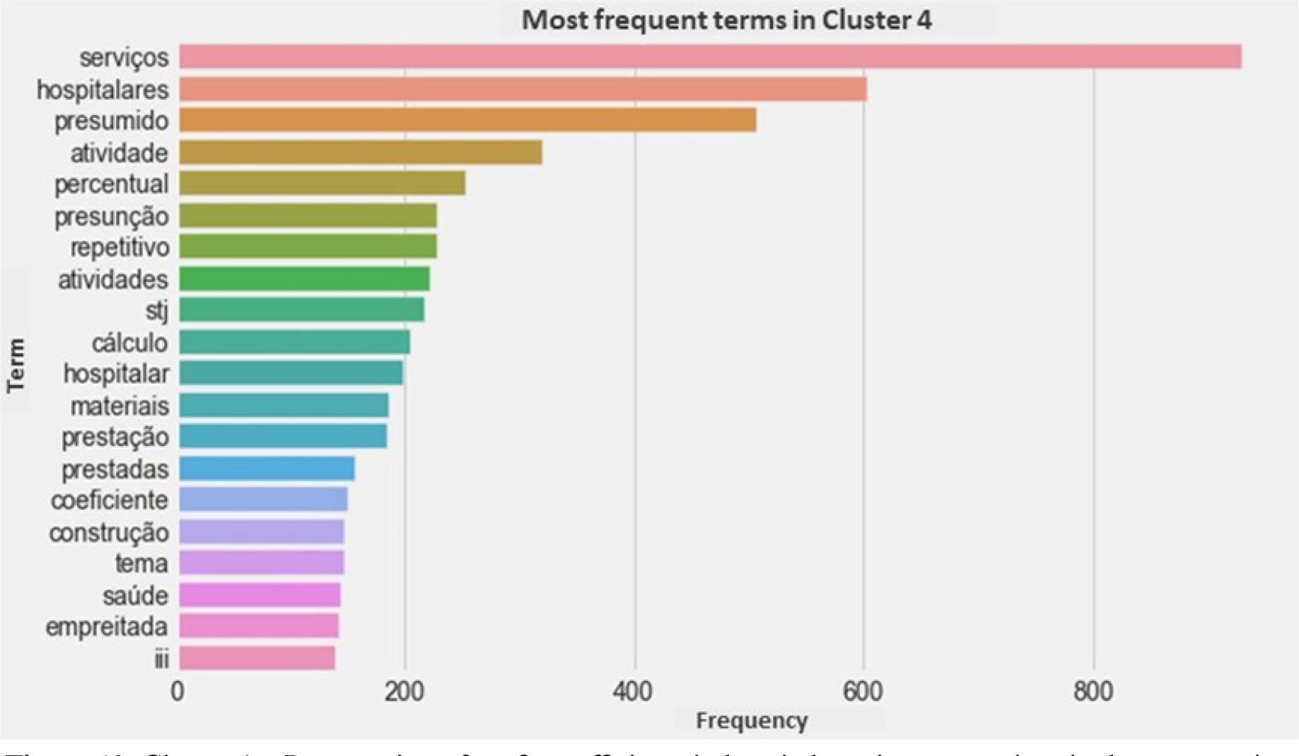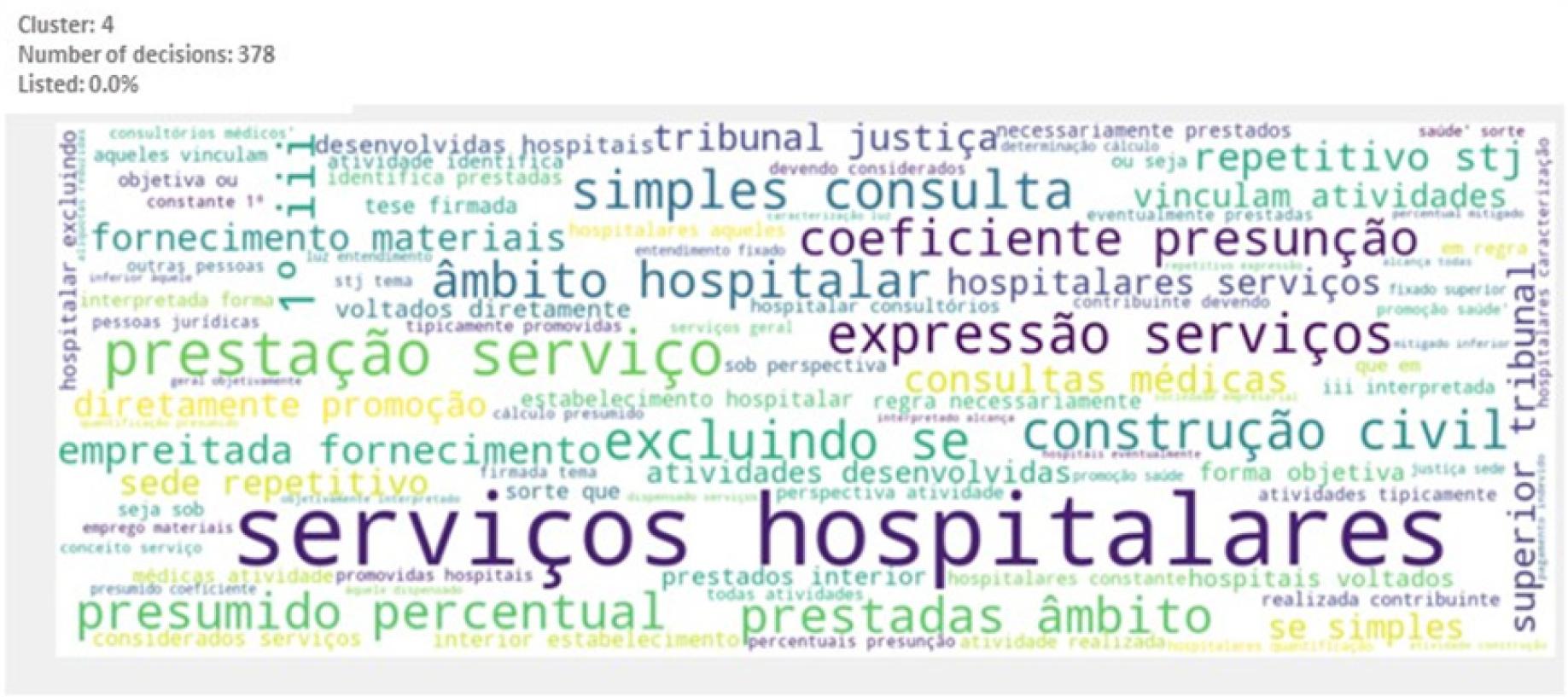 Main words or expressions that characterize the cluster: “percentual”, “coeficiente”, “serviços hospitalares”, “presumido”, “repetitivo”, “STJ”, “construção civil”, “empreitada”, “fornecimento” (percentage, coefficient, hospital services, presumed, repetitive, Superior Court of Justice, civil construction, contract work, supply).
