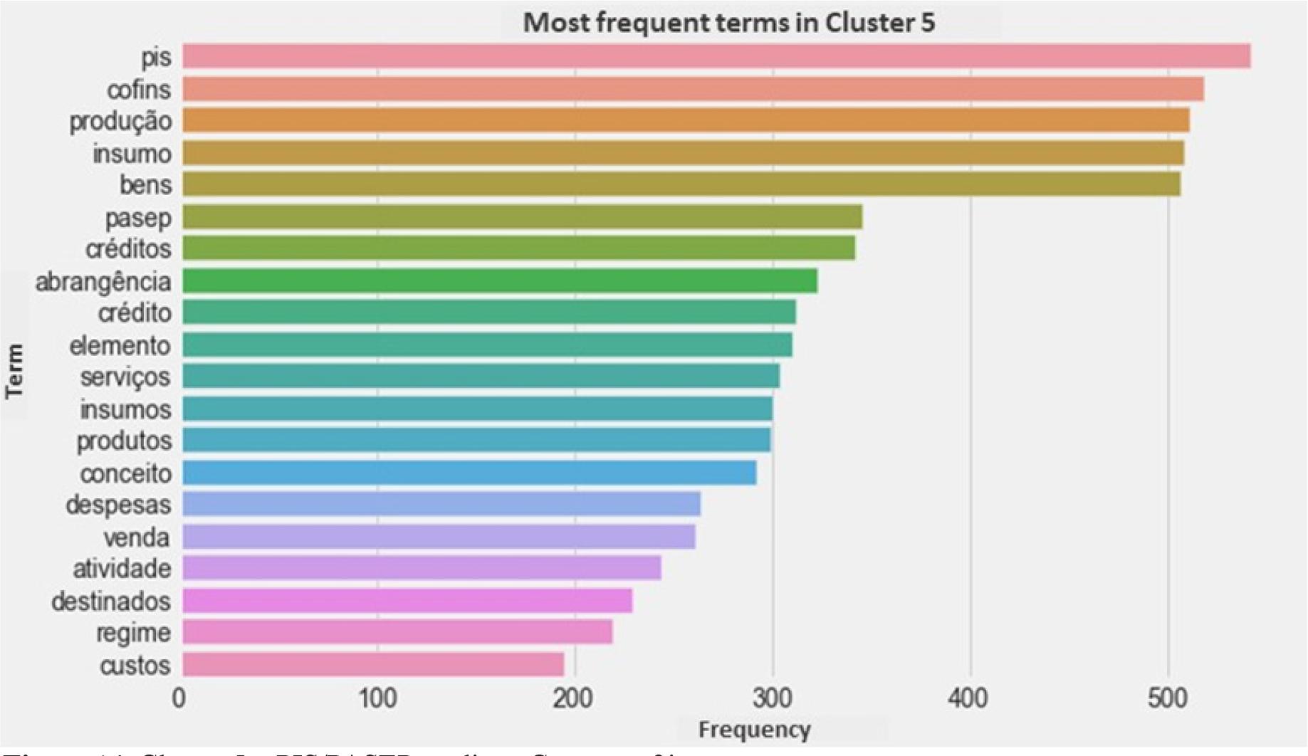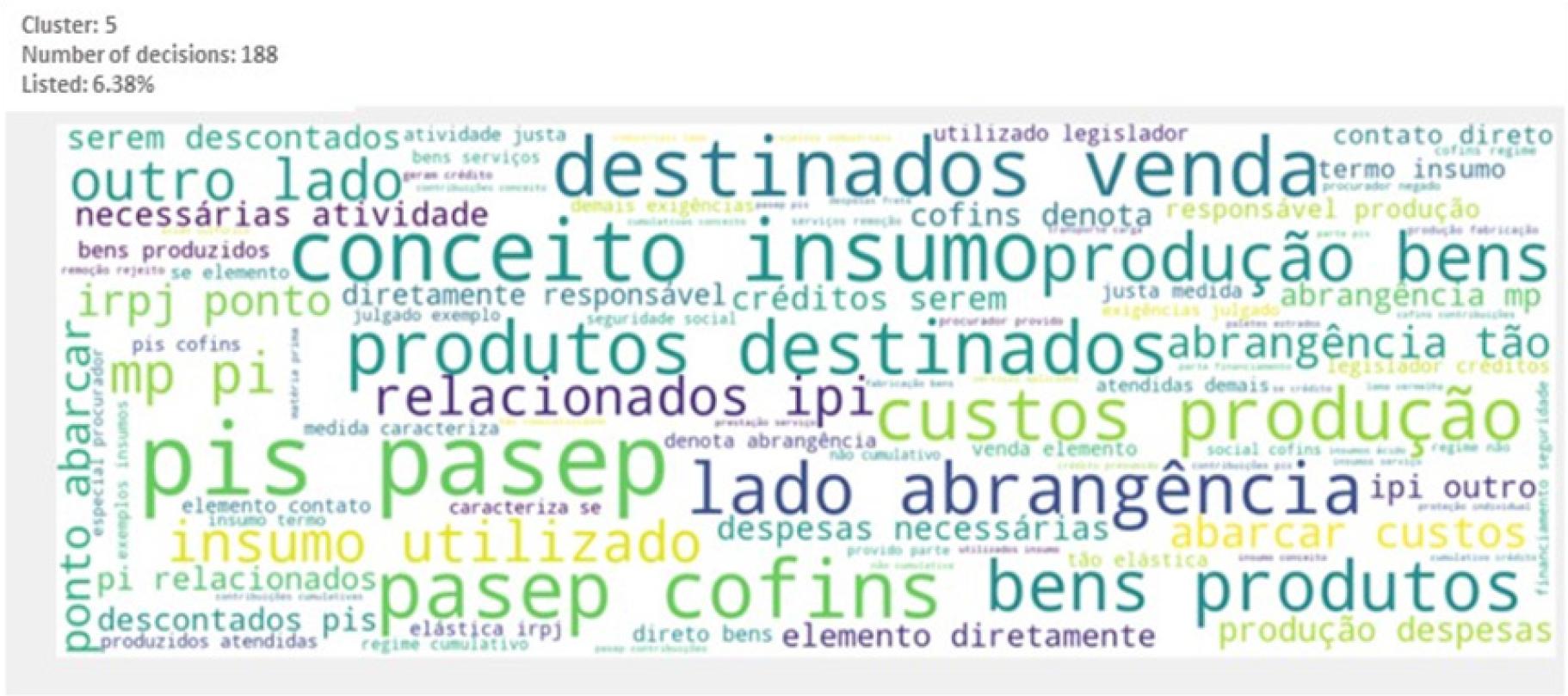 Main words or expressions that characterize the cluster: “PIS”, “PASEP”, “COFINS”, “créditos”, “conceito”, “insumos”, “produtos”, “bens”, “serviços”, “destinados”, “venda” (PIS, PASEP, COFINS, credits, concept, inputs, products, goods, services, destined, sale).