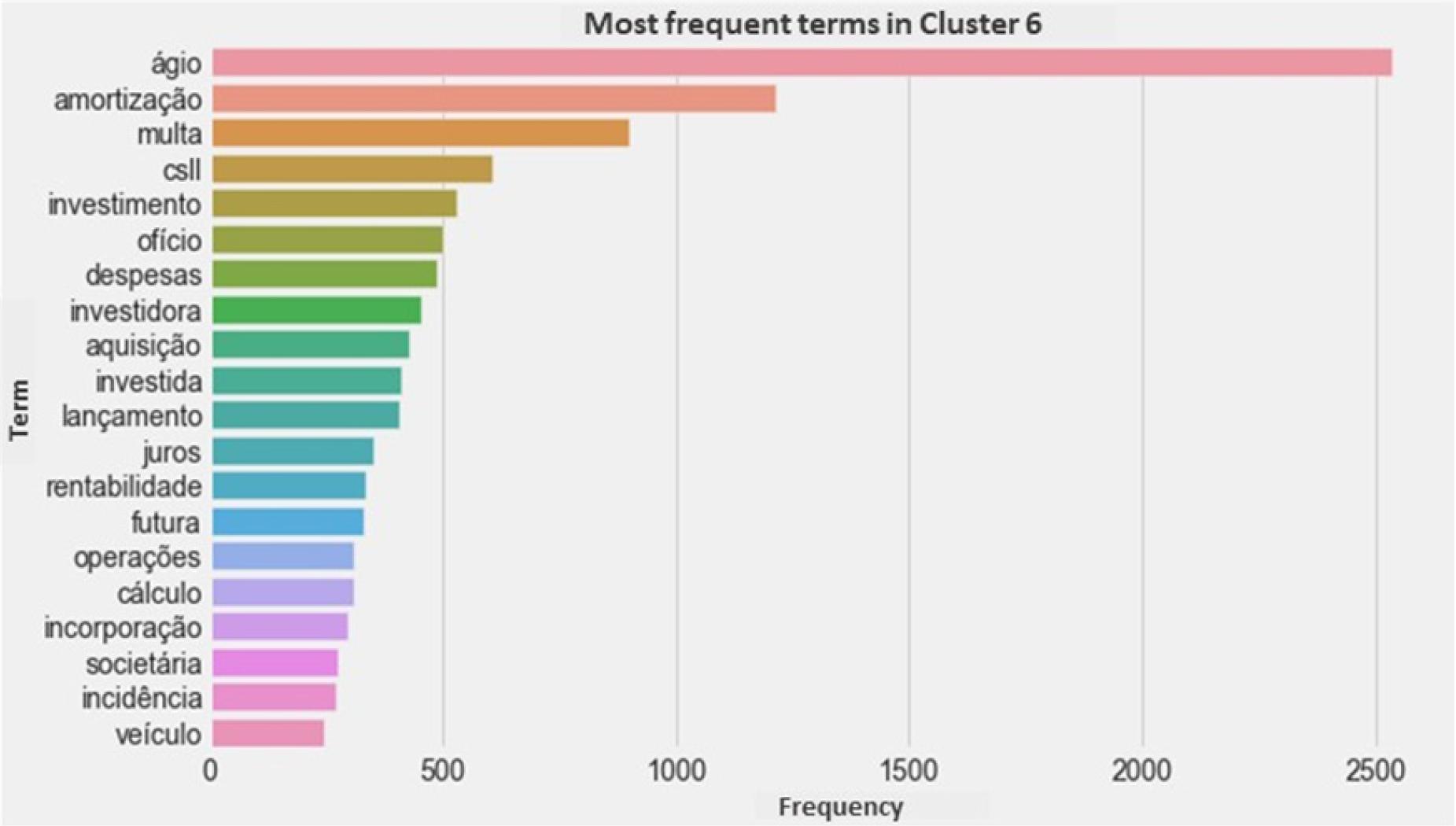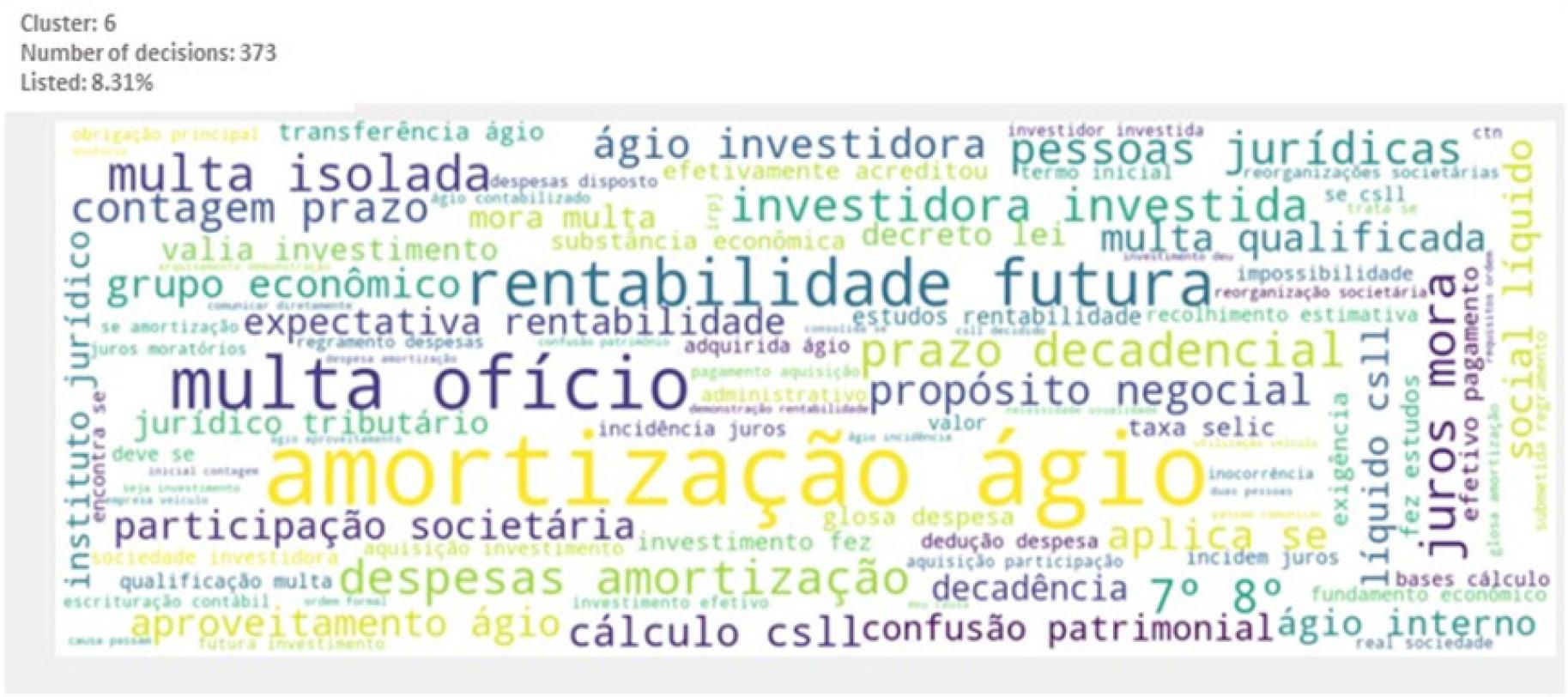 Main words or expressions that characterize the cluster: “amortização”, “ágio”, “rentabilidade futura”, “investidora”, “investida”, “aquisição”, “investimento”, “grupo econômico”, “ágio interno”, “veículo”, “transferência ágio”, “participação societária”, “efetivo pagamento”, “propósito negocial”, “substância econômica”, “multa”, “ofício”, “isolada” (amortization, premium, future profitability, investor, investee, acquisition, investment, economic group, internal premium, vehicle, premium transfer, shareholding, effective payment, business purpose, economic substance, fine, ex-officio, isolated).