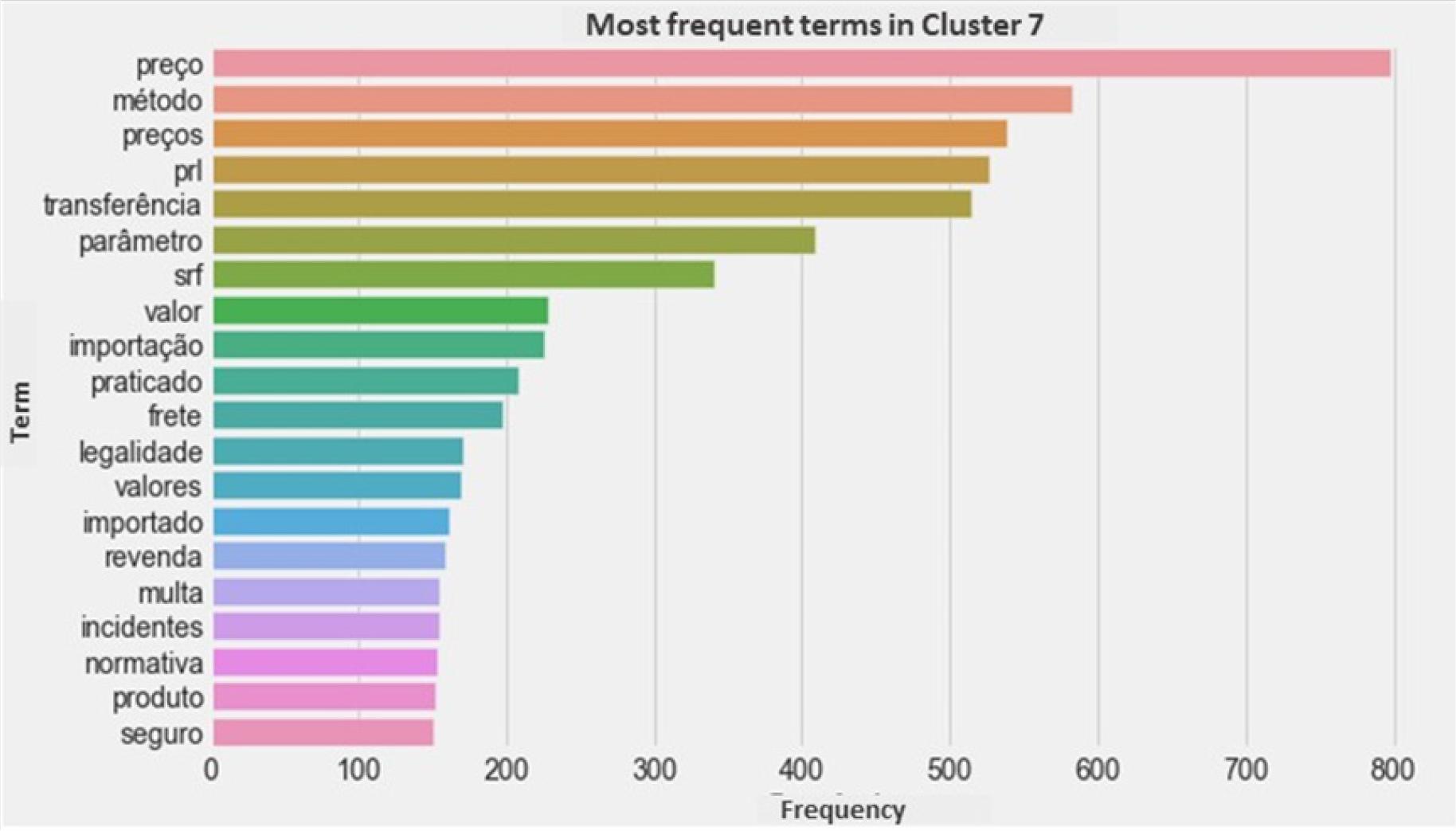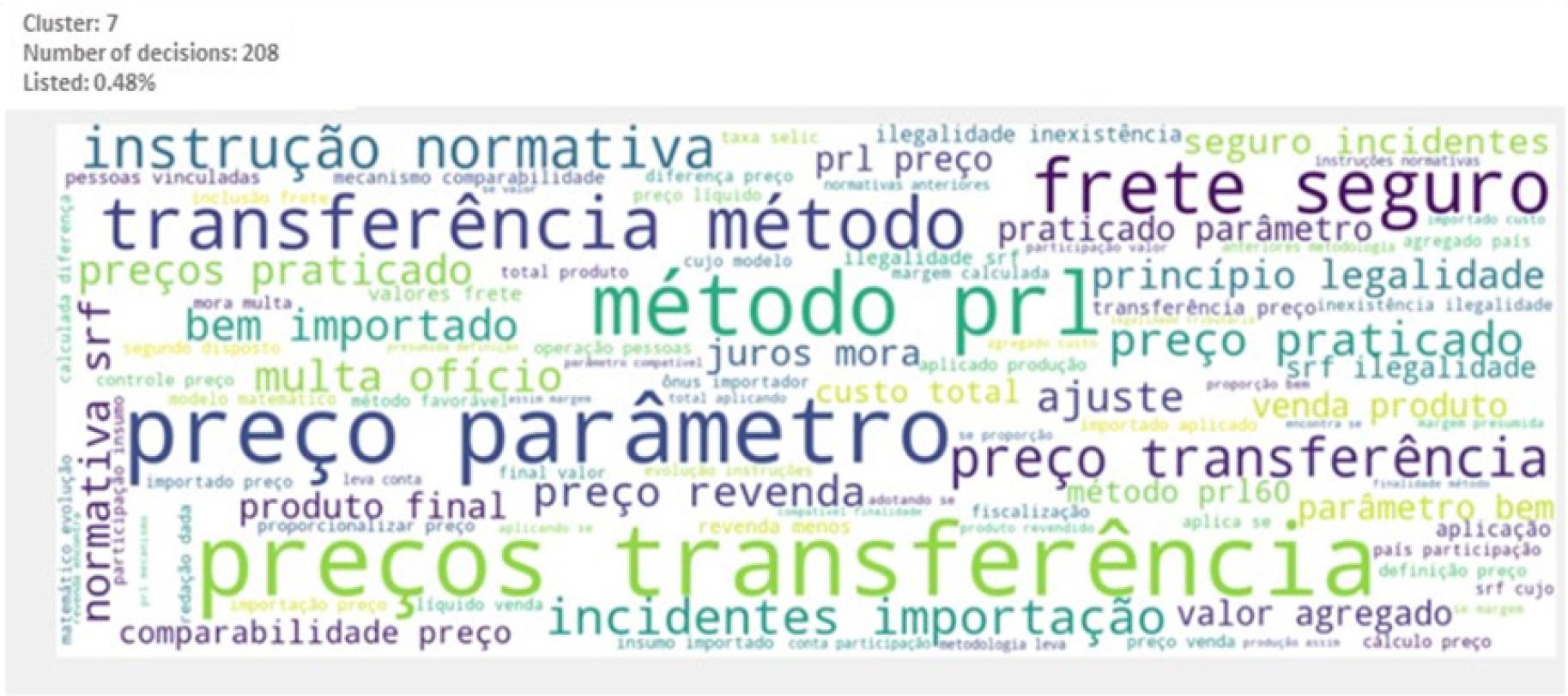 Main words or expressions that characterize the cluster: “preço”, “preços”, “método”, “transferência”, “método PRL”, “preço parâmetro”, “instrução normativa”, “bem importado”, “frete”, “seguro”, “valor agregado” (price, prices, method, transfer, PRL method, parameter price, normative instruction, imported good, freight, insurance, added value).