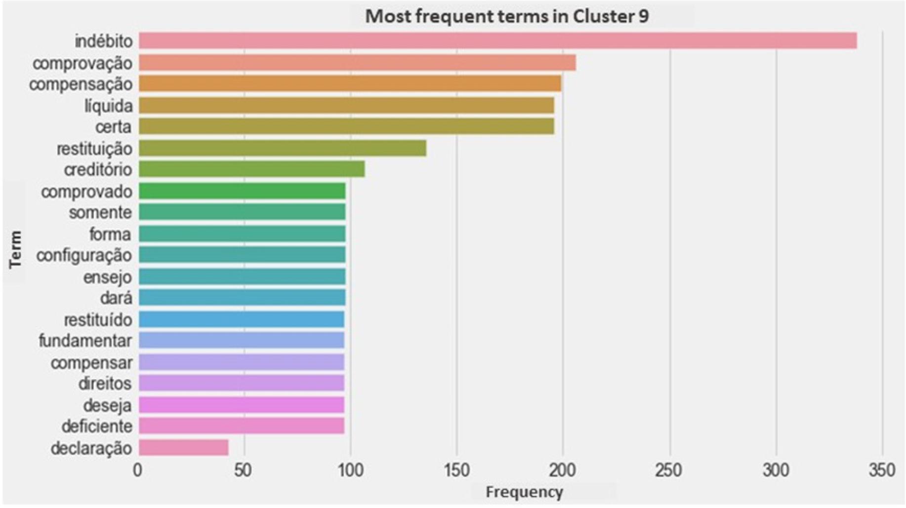 The clusters obtained from the judgments’ summary analysis were described based on the issues addressed in each one. Based on this analysis, it was possible to associate each cluster with the main issue contained therein, as described below. The “cluster characterizing words” were those most relevant in the context and not necessarily the most frequent. Before evaluating and viewing the results, the judgments belonging to each cluster were counted.