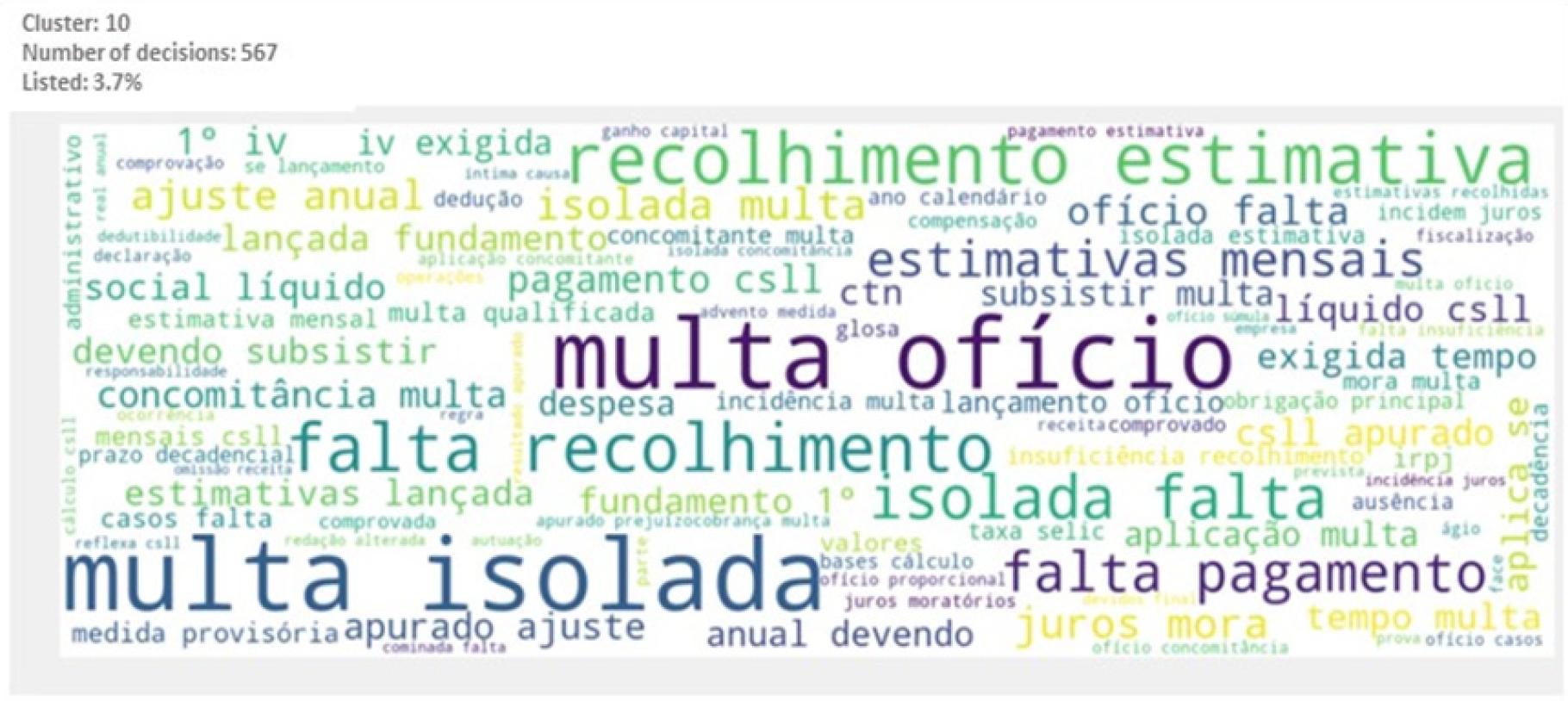 Main words or expressions that characterize the cluster: “multa isolada”, “multa”, “ofício”, “juros”, “falta recolhimento”, “falta pagamento”, “recolhimento estimativa”, “estimativas mensais”, “ajuste anual”, “concomitância”, “incidência”, “IRPJ”, “CSLL” (isolated fine, fine, ex-officio, interests, missing collection, missing payment, estimated collection, monthly estimates, annual adjustment, concomitance, incidence, IRPJ, tax on net profit).
