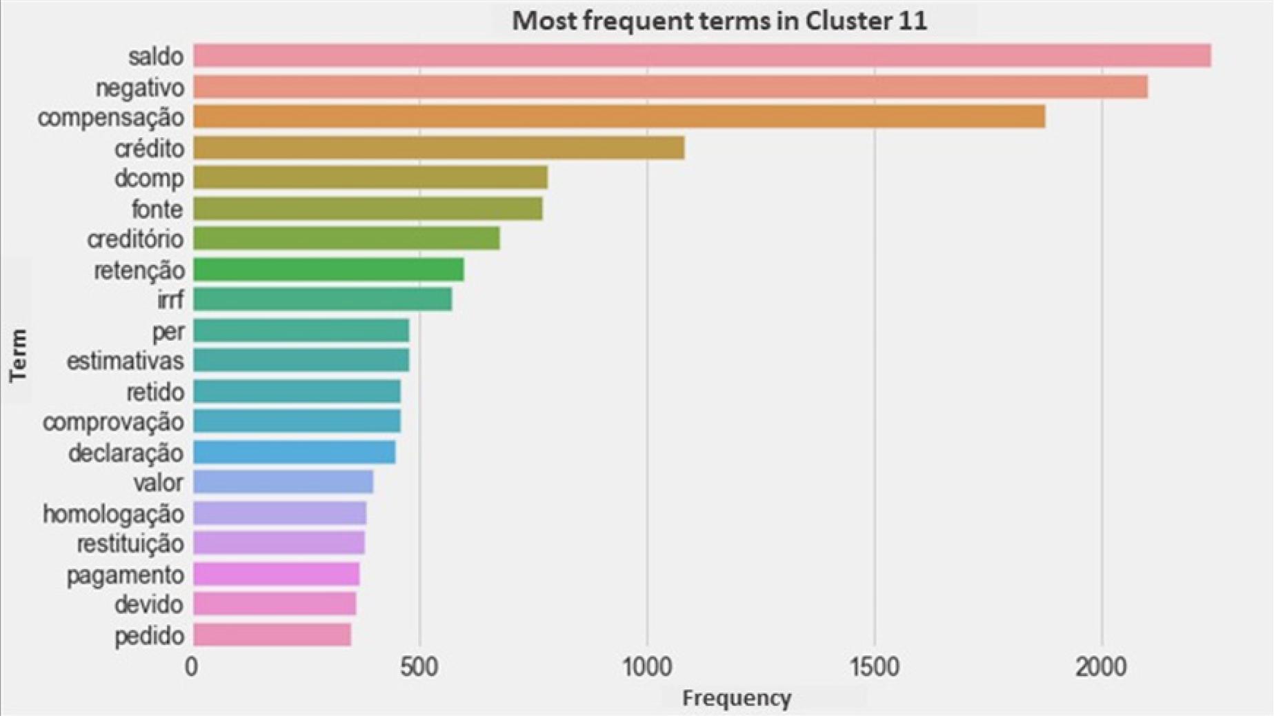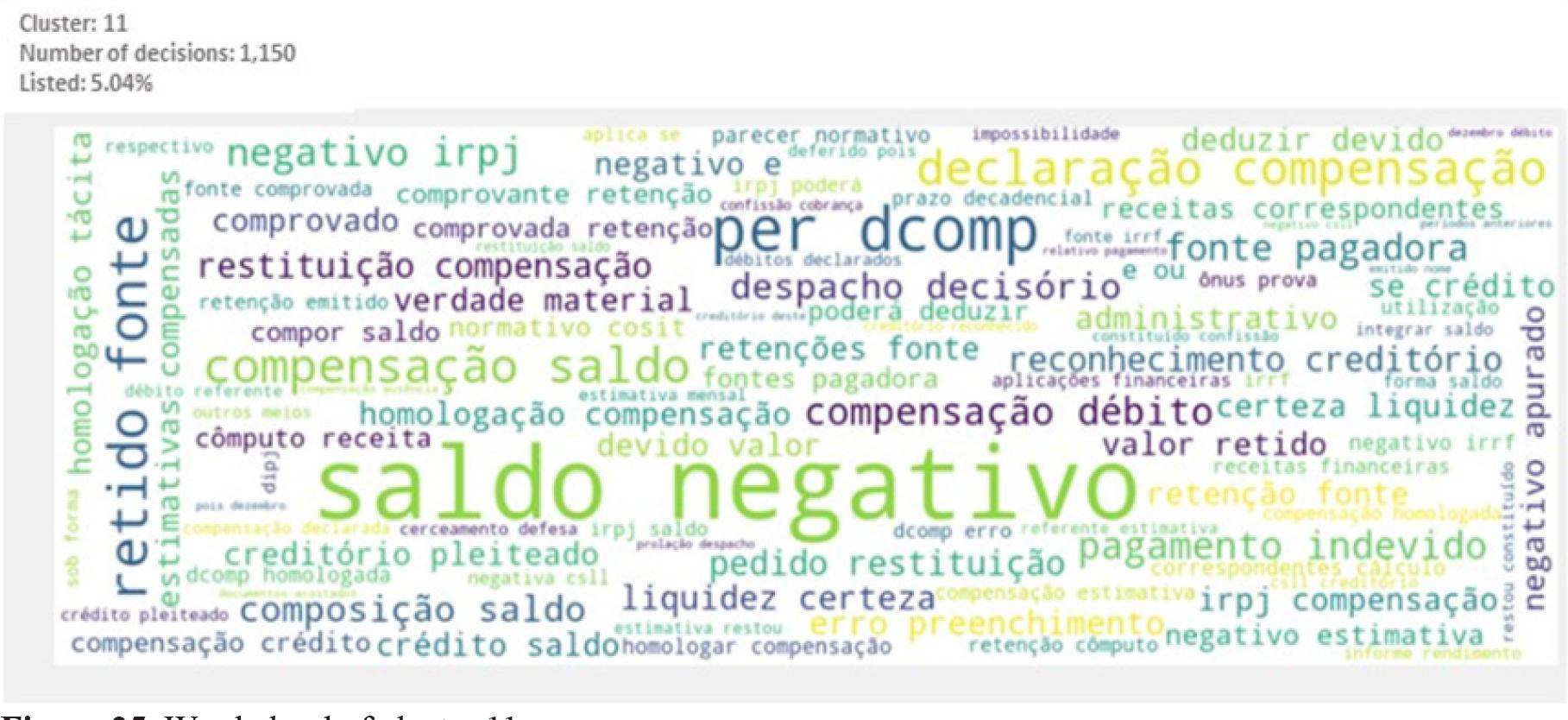 Main words or expressions that characterize the cluster: “saldo negativo”, “PER”, “DCOMP”, “compensação”, “estimativas compensadas”, “retido”, “fonte”, “retenção”, “IRRF”, “creditório”, “declaração compensação”, “fonte pagadora”, “homologação” (negative balance, electronic request of refund, compensation declaration, offset, compensated estimates, withheld, provider, withholding, income tax withholding, document backing a credit, compensation declaration, payroll provider, homologation).