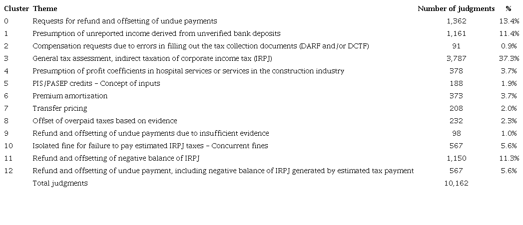 Future studies may expand the scope of the analysis to other taxes - for example, personal income tax (IRPF), contributions to programs that finance unemployment and other work-related benefits (PIS/PASEP), the contribution for social security financing (COFINS), and taxes on foreign trade - and the period of the judgments analyzed, covering, for example, those issued after 2010. This approach would allow for a classification of relevant themes for different taxes. In the methodological aspect, another possibility would be the application of clustering algorithms using other database characteristics, such as the type of judgment, the year of the inspection, the amount of the tax credit in dispute, and the entire text of the judgment (instead of only the judgment summary).