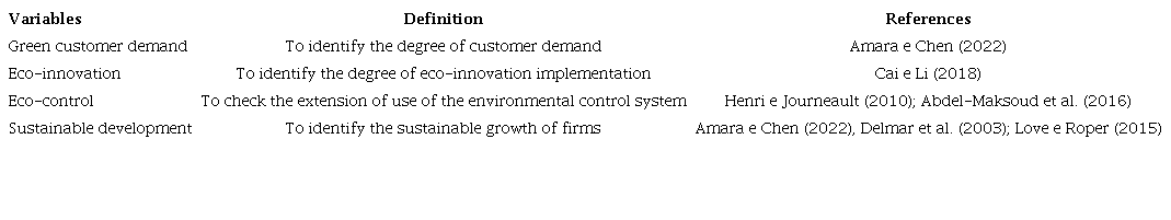 The effects of eco-control (the use of environmental performance indicators, rewards, and budget) on environmental and economic performance have been studied for decades (Abdel-Maksoud et al., 2021; Lunkes et al., 2020; Abdel-Maksoud et al., 2016; Henri & Journeault, 2010). These studies show that eco-controls help companies face their environmental responsibilities and achieve economic benefits, by reducing costs or improving their image and community relations (Abdel-Maksoud et al., 2016). Therefore, the environmental control system translates environmental goals and activities into competitive advantages and, ultimately, superior financial performance (Henri & Journeault, 2010; Guenther et al., 2016; Gomez-Conde et al., 2019). However, little is known about its effects on eco-innovation, such as the use of technology to reduce resource consumption and material recycling. Another relevant factor is consumer demand for sustainable products (Chen, 2008; Rabadán et al., 2019; Amara & Chen, 2022). According to Chen (2008) and Amara and Chen (2022), companies are motivated to adopt sustainable processes or products in order to develop a good reputation with their customers. Thus, in the context of Brazilian agribusiness, we sought to understand the factors that push managers to adopt these processes or products. Considering these research gaps, we proposed to answer the following question: what is the influence of factors related to green customer demand and eco-control on eco-innovation and sustainable growth, in the beef sector?