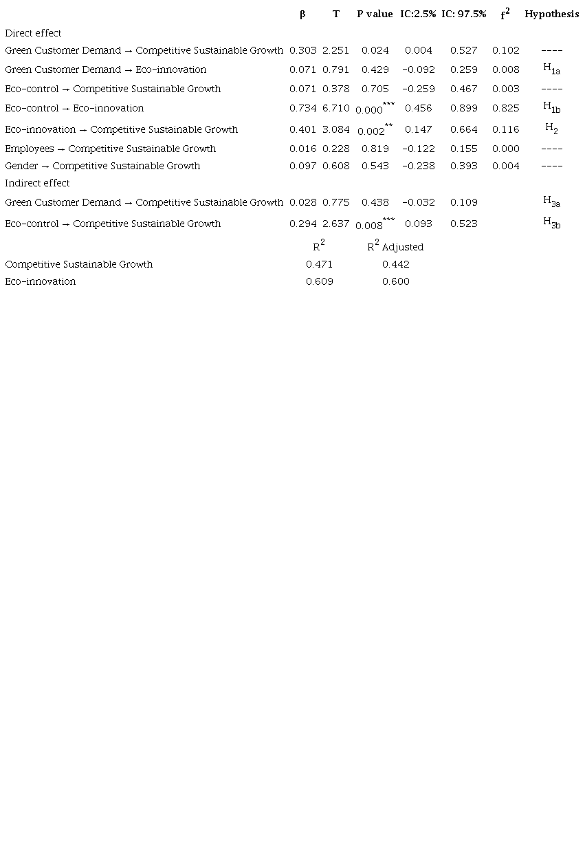H3a proposed that eco-innovation mediated the relationship between green customer demand and sustainable competitive growth. The results indicated a positive and non-significant relationship (p=0.438), and that green customer demand did not influence eco-innovation. Hypothesis H3b suggested that eco-innovation mediated the relationship between eco-control and sustainable competitive growth. The findings indicated a positive and significant relationship (p<0.01), and that control variables - number of employees and gender - did not affect them.