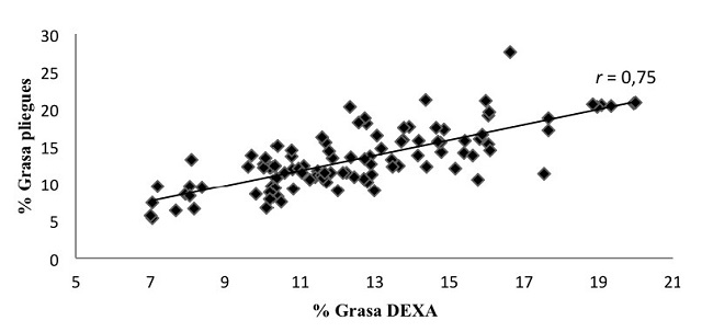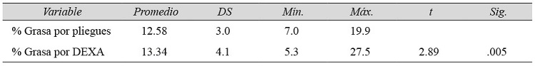 Cuando se comparó ambos métodos, el porcentaje de grasa obtenido mediante el uso del DEXA fue mayor y estadísticamente significativo respecto al determinado por pliegues cutáneos, lo que concuerda con lo expuesto por Bell et al., 2005; Buehring et al., 2014 y Micklesfield et al., 2012, quienes reportan diferencias estadísticamente significativas entre el DEXA y otros métodos indirectos de medición del porcentaje de grasa corporal.