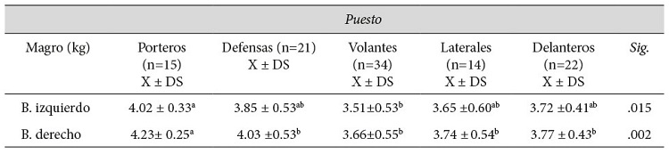 Al comparar el comportamiento de la masa magra por segmentos según posición de juego, los resultados obtenidos indican que a nivel del brazo izquierdo, se registra una diferencia estadísticamente significativa solo entre los guardametas y los volantes. Para el caso del brazo derecho, los guardametas tienen una masa magra mayor y estadísticamente significativa con respecto a los volantes (p = 0.002), laterales (p = 0.001) y delanteros (p = 0.006), no así con respecto a los defensas (p >0.05). Estos resultados pueden ser justificados por la especificidad del trabajo al cual están sometidos los porteros en sus entrenamientos y competencia propiamente dicha. Los análisis realizados a nivel de las piernas no reportaron diferencias significativas entre puestos.