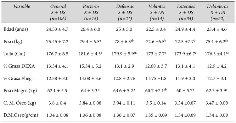 En el estudio participaron 106 futbolistas masculinos pertenecientes a cuatro equipos de la Primera División costarricense, con una edad promedio de 24.53 ± 4.8 años, peso 75.5 ± 7.2 kg, estatura 177 ± 6.5 cm. De acuerdo con la posición de juego los jugadores fueron categorizados en porteros (n=15), defensas (n=21), volantes (n=34), laterales (n=14) y delanteros (n=22). Los jugadores recibieron información previa a su participación en las pruebas, las cuales constituyeron parte de las valoraciones planeadas por los cuerpos técnicos de cada equipo. Se contó con el consentimiento informado de los jugadores y con el permiso respectivo por parte de sus equipos para la publicación de los datos.