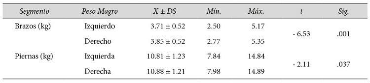 El método DEXA para medir la composición corporal permite determinar la distribución tanto de la masa grasa, como de la masa magra y la densidad mineral ósea en los distintos segmentos corporales como el tronco y las extremidades. La muestra de este estudio, presentó un peso magro de 62.1 kilogramos, el cual es muy similar al reportado en estudios realizados con futbolistas de Suecia y futbolistas argentinos, de 62 y 63.3 kilogramos, respectivamente (Magnusson et al., 2001; Wittich et al., 1998). En cuanto al peso magro por segmentos, se encontró que el promedio de masa magra del brazo derecho fue un mayor que el del brazo izquierdo (t = -6.53, p = 0.001), mientras que para la distribución de la masa magra a nivel de tren inferior, los datos registrados indican un peso magro en la pierna derecha mayor que en la pierna izquierda (t = -2.11, p = 0.037). Estos resultados podrían explicarse desde la posible predominancia de la lateralidad derecha de la muestra analizada, tanto a nivel de brazos como de piernas (Newton et al, 2001).