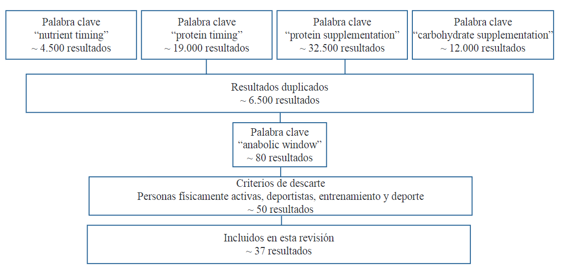 El número de artículos que arroja la búsqueda para cada palabra son: 1) “nutrient timing”: alrededor de 4.500 resultados, 2) “protein timing”: alrededor de 19.000, 3) “protein supplementation”: alrededor de 32.500, 4) “carbohydrate supplementation”: alrededor de 12.000 y 5) “anabolic window”: alrededor de 80. La búsqueda realizada en las bases de datos en castellano arroja muy pocos resultados para las palabras clave utilizadas.