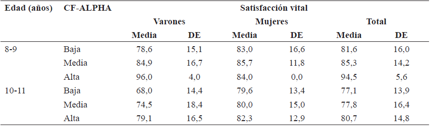 La Tabla 3 muestra el análisis descriptivo de la asociación entre CF y satisfacción vital. La prueba ANOVA (datos post hoc no mostrados) no detectó diferencias estadísticamente significativas entre los grupos estudiados (p > 0,1). Si profundizamos en el análisis, los varones con un nivel alto de CF presentaron valores promedio más elevados con respecto a sus pares homólogos con un grado de CF bajo o medio. Por otro lado, las mujeres de 8-9 años con un nivel medio de CF y las de 10-11 años con un nivel alto de CF tenían los valores promedio más elevados de satisfacción vital.