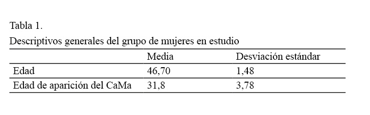 Se pudo identificar que las mujeres presentan una edad promedio de 46,7 años, lo que concuerda con estudios a nivel mundial donde se evidencia que la prevalencia del cáncer de mama relacionada con la edad corresponde a mujeres mayores de 40 años (Talley y Williams, 2015). Estudios infieren y sustentan que la aparición del cáncer de mama está mediado por factores endocrinos relacionados con “la duración de la vida menstrual de la mujer, en especial la menarca, (…), el inicio temprano de la menopausia, la nuliparidad y el tener un hijo después de los 30 años de edad” (Gómez, Altagracia, Kravzov, Cárdenas y Rubio, 2008, p. 62). Por otro lado, “la manifestación tardía de la menopausia (55 años o más) incrementa 2,5 veces el riesgo, mientras que la menopausia artificial por castración quirúrgica, antes de los 40 años, ha demostrado disminución significativamente el riesgo” (Rodríguez y Capurso, 2006, p. 589). Estos hecho concuerdan con lo encontrado en este proceso investigativo, que además resalta la importancia de generar estrategias de prevención hacia la población femenina en edades previas a los 40 años.