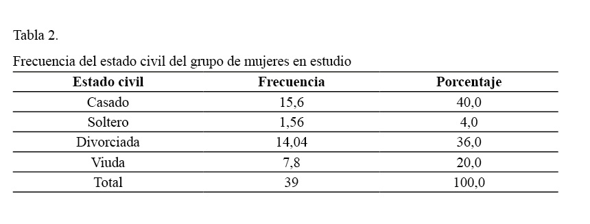 La siguiente tabla enuncia la frecuencia relacionando el estado civil de la población, en el que se encontró un alto porcentaje de mujeres con una pareja estable (Tabla 2).