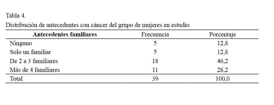 Las mujeres refieren que los antecedentes familiares de cáncer se manifiestan en diferentes órganos como pulmón (25 %), faringe (10 %) y colon (20 %), mientras que la mayor población con antecedentes prevaleció en glándula mamaria con un 35 %.
