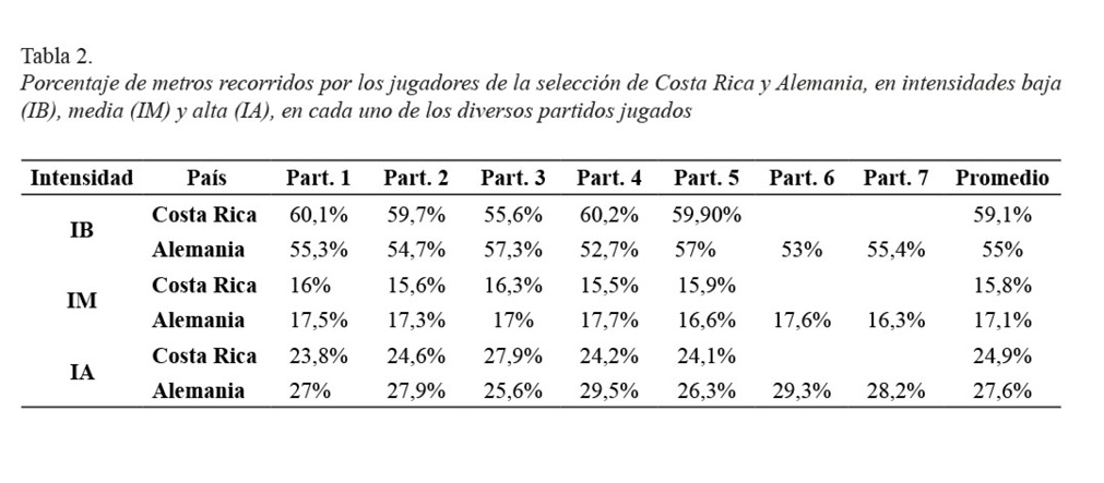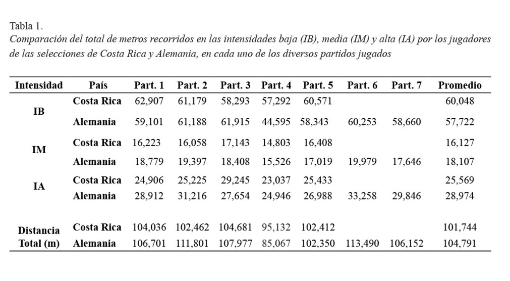 La selección alemana de fútbol, en comparación con su similar de Costa Rica, obtuvo un promedio por partido más alto en metros recorridos en las intensidades media y alta. Además, la misma selección alemana realizó, significativamente por partido, un promedio porcentual de metros recorridos en intensidad media y alta, mayor que Costa Rica. También, los resultados del estudio mostraron una tendencia hacia las selecciones que en los partidos del mundial utilizaron mayor cantidad de metros recorridos en intensidades media y alta, a ubicarse en una mejor posición en la tabla final del Mundial de Brasil 2014.