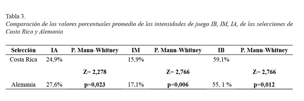 Como se observa en la tabla 3, en el contraste entre los valores promedio de las diversas intensidades de juego aplicadas por ambos equipos en la Copa del Mundo Brasil 2014, se presentaron diferencias significativas: los jugadores de la selección alemana recorrieron más metros en intensidad alta y media que los jugadores costarricenses; mientras que estos últimos recorrieron más metros en intensidad baja, en relación con los jugadores alemanes.