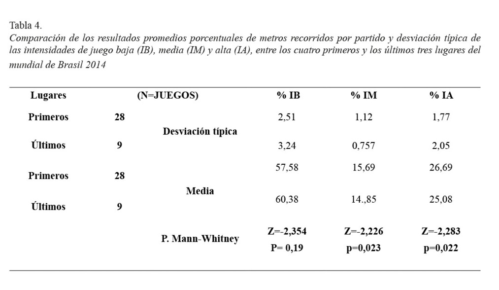 Al analizar la tabla anterior, se observa que hubo diferencias significativas entre todos los promedios porcentuales de metros recorridos en las diversas intensidades de las selecciones nacionales que se ubicaron en los primeros lugares (Alemania, Argentina, Holanda y Brasil), en comparación con las que se ubicaron en los últimos lugares (Japón, Camerún y Honduras). Las primeras desarrollaron en promedio más metros recorridos en IA e IM que los equipos que se ubicaron en los últimos lugares; contrariamente, las selecciones que quedaron en los últimos lugares obtuvieron un mayor promedio porcentual en metros recorridos en IB que sus similares ubicados en los primeros lugares del mundial de Brasil 2014.