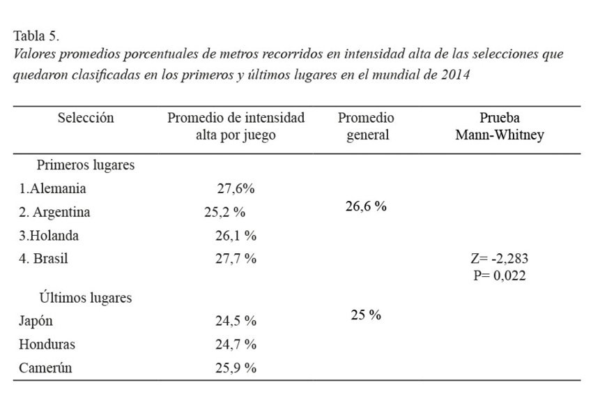 Tal como se observa en la tabla anterior (tabla 5), las selecciones clasificadas en los primeros lugares del mundial de Brasil 2014 recorrieron, en promedio porcentual por partido, más metros en intensidad alta (26,69 %) que las selecciones que se ubicaron en los últimos lugares (25,08 %).