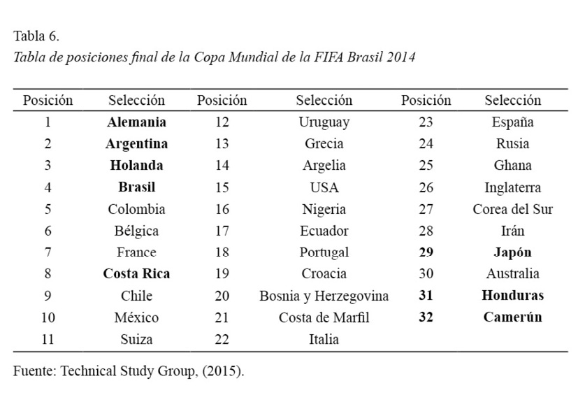 En la tabla 6, se observan las posiciones oficiales definitivas del mundial de Brasil 2014, donde las selecciones objeto de estudio, Alemania y Costa Rica, se ubicaron en el primer y octavo lugar del torneo, respectivamente. Además, en esta tabla se pueden observar las posiciones que ocuparon las otras selecciones que fueron tomadas como referencia para el estudio: la selección de Argentina se ubicó en el segundo lugar, Holanda en el tercero, y Brasil en cuarto lugar. Al lado opuesto de la tabla de posiciones, aparece la ubicación de las selecciones de Japón, Honduras y Camerún, que se ubicaron en los últimos lugares, puestos 29, 31 y 32, respectivamente.