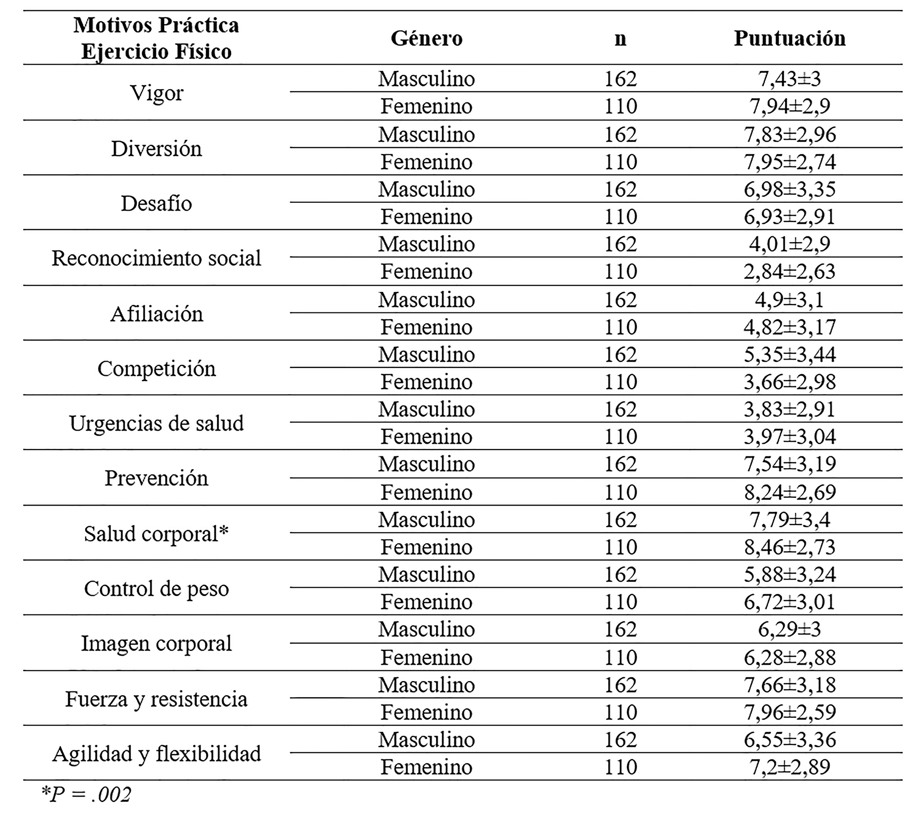 En la tabla 1 se observan las puntuaciones promedio para cada uno de los motivos para la práctica de ejercicio físico según el género, los cuales demostraron que después de un análisis comparativo existen diferencias estadísticamente significativas (T = -1,802; sig = .002) entre hombres y mujeres. Específicamente, la puntuación promedio para los motivos relacionados con la salud corporal fue significativamente mayor en las mujeres (8,46±2,73) en comparación con los hombres (7,79±3,4).