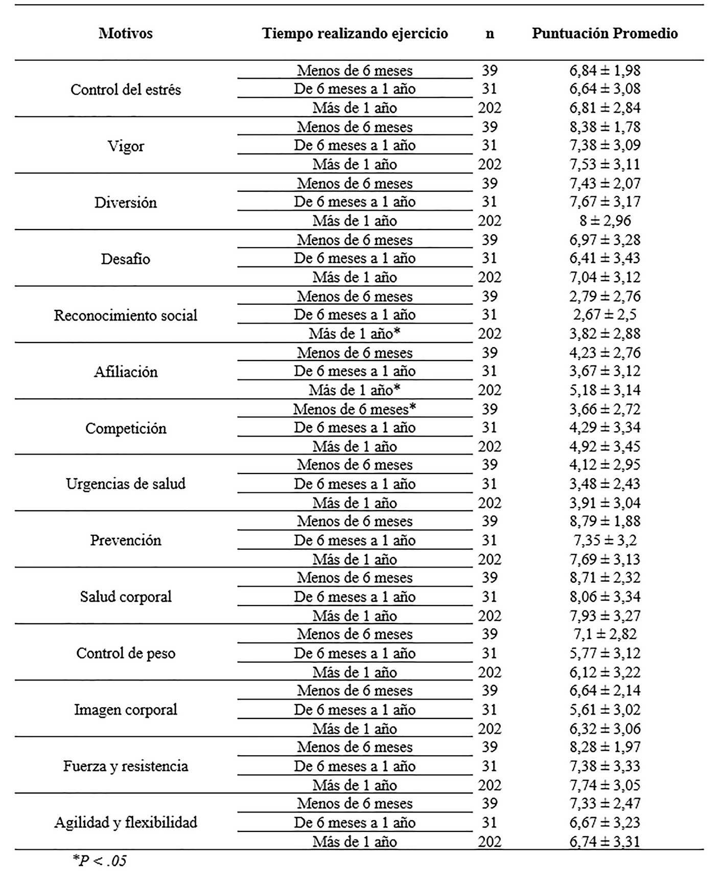 Con respecto al tiempo que llevan realizando ejercicio físico de forma continua, las personas con más de un año mostraron resultados mayores asociados a motivos referentes a la sensación de afiliación, en comparación con las personas que llevan menos tiempo con dicha práctica. Estos resultados concuerdan con los mencionados en trabajos previos (Azofeifa, 2006; Guedes et al., 2013; Ramírez et al., 2013), en donde se manifiesta que las personas que llevan mayor tiempo realizando ejercicio físico lo relacionan con actividades más placenteras. Lo anterior puede ser explicado bajo la línea de estudios previos apoyados en el modelo transteórico del cambio, el cual indica que personas que encuentran en un estadio de mantenimiento hacia la práctica de ejercicio físico y han podido generar mecanismos sobre sus procesos cognitivos y de comportamiento incentivan motivos con características más autodeterminadas que les permite asociar la práctica permanente de ejercicio físico como un factor de disfrute (Azofeifa, 2006; Gómez-Tinoco, 2013; Jiménez-Castuera, Moreno-Navarrete, Leyton-Román y Claver-Rabaz, 2015; Sanclemente-Agualimpia y Arias-Henao, 2014; Sicilia et al., 2014).