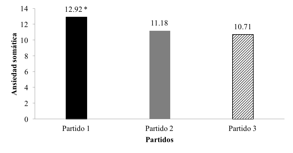 La ansiedad somática hace referencia a la percepción de indicadores fisiológicos de la ansiedad, como tensión muscular, aumento de frecuencia cardíaca, sudoración y malestar en el estómago (Ruiz, Zarauz, et al., 2015), esta misma variable según el estudio de Bueno, Capdevila y Fernández (2002) se va disipando a medida que va avanzando la competición, lo cual podría explicar el resultado que se obtuvo en la presente investigación, al comparar la ansiedad somática entre los tres partidos, pues fue mucho más alta en el primer partido en comparación con el segundo y el tercero.