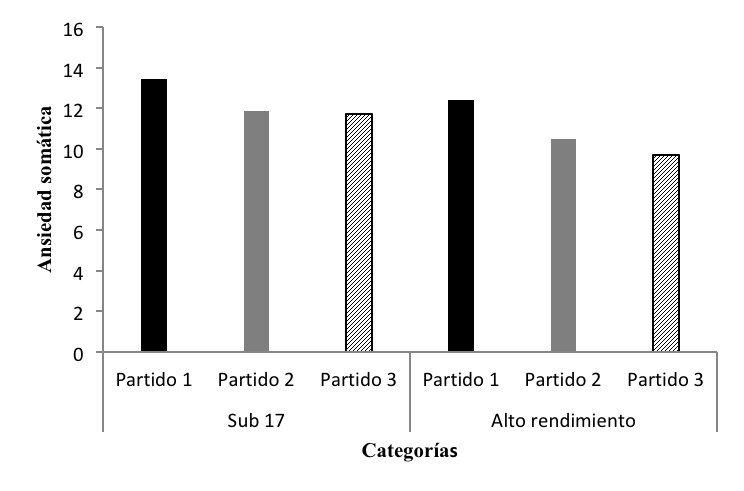 Se realizó una comparación de todas las variables entre las dos categorías de jugadores a lo largo de los tres partidos, en ninguno de los casos se identificó interacción entre ambos factores. Solo se registró diferencias significativas entre los diferentes juegos analizados en el constructo de ansiedad somática. El análisis de varianza mixto para la variable ansiedad somática mostró diferencias significativas entre los partidos, sin efecto asociado con la categoría de los jugadores, F(2, 46) = 10.21, p < .001. En el partido 1 se presentaron mayores índices de ansiedad somática (12.92 ± .69) en comparación con el partido 2 (11.18 ± .79), y con el partido 3 (10.71 ± .58). La representación gráfica de resultados anteriores se puede observar en la Figura 1.