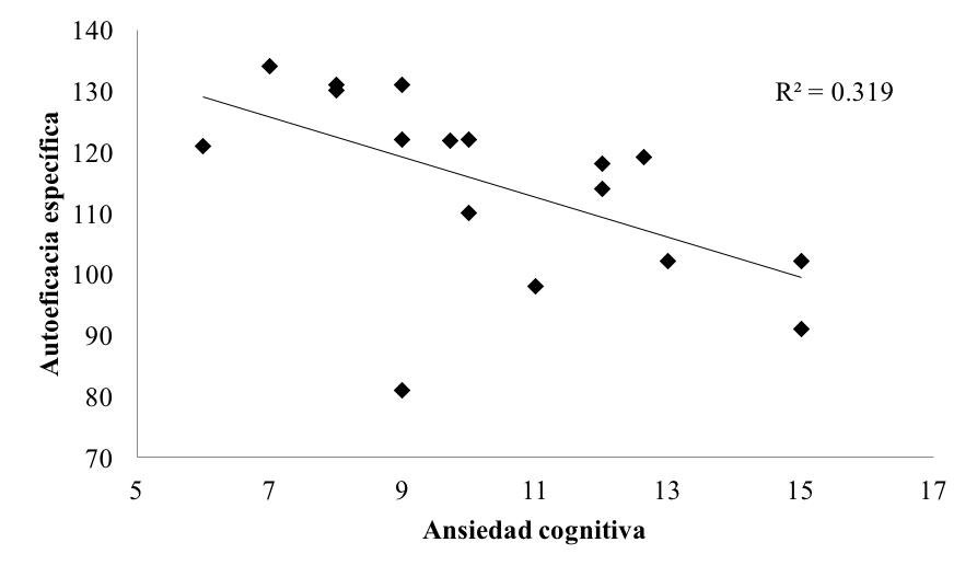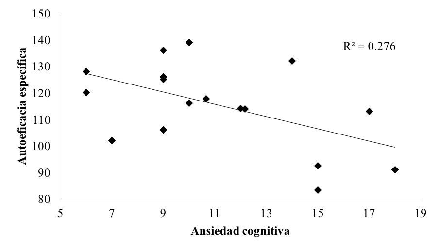 El estado de autoeficacia en el ámbito deportivo se utiliza con frecuencia para referirse a la percepción que tiene la persona sobre su capacidad para enfrentarse a una determinada tarea (González et al., 2014). Según Ortín Montero et al. (2013), los sujetos optimistas sienten menos ansiedad estado, tanto fisiológica como cognitiva y una mayor autoeficacia. En general, un deportista con valores altos en autoeficacia, mostraría valores bajos en ansiedad (Pinto y Vázquez, 2013; Ruiz, Zarauz, et al., 2015). Particularmente, la autoeficacia específica tiende a correlacionar de forma inversa con la ansiedad precompetitiva (Jaenes et al., 2012; Ortín Montero et al., 2013), lo que redundaría en mayores probabilidades de éxito deportivo (Jaenes et al., 2012). En los resultados de la presente investigación se encontraron relaciones negativas y significativas entre los constructos de ansiedad cognitiva y autoeficacia específica, lo cual coincide con la teoría y la tendencia de investigaciones previas.