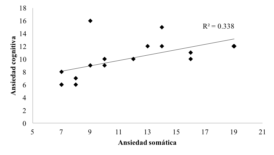 Asimismo, en los tres partidos se analizaron las correlaciones de forma separada por categoría. En el primer partido las variables que evidenciaron relaciones significativas para la sub 17 fueron: ansiedad cognitiva y autoeficacia específica (r= -.52, p= .037), representado en la Figura 3, y ansiedad somática y ansiedad cognitiva (r= .87, p<.001) en la Figura 4. En la categoría juvenil no se encontraron correlaciones significativas.