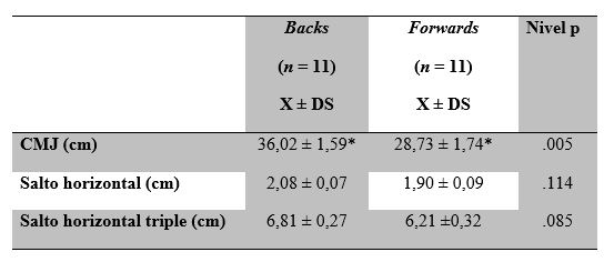En la tabla 2, se encontraron diferencias estadísticamente significativas (*) en las variables CMJ (p = .005) entre los grupos de backs y forwards. Esto indica que los backs posen más condición neuromuscular que los forwards, en función de una menor masa de grasa.