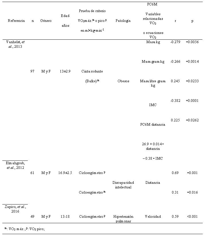 En las Tabla 1 y la Tabla 2 se describen los artículos científicos que relacionan la PC6M con el VO2 en individuos con patologías menores y mayores a 18 años, debido a que factores del desarrollo pueden influir en las pruebas físicas. También en las tablas, algunas variables que se relacionan con el VO2 no se asocian directamente al rendimiento aeróbico, y si bien se encuentran variables como la ventilación y la hemoglobina estas son difíciles de medir.