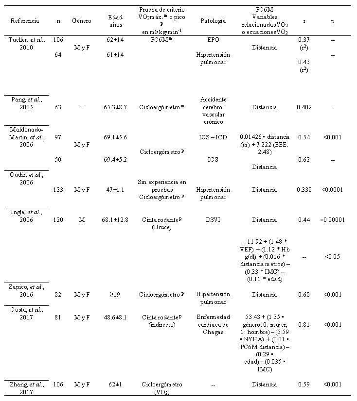 Se concluye que la variable que más se mide en la PC6M es la distancia, por tanto, es la variable que más se asocia con el VO2 y estas correlaciones tienen valores bajos, moderados y altos en que muchas son significativas. Otra variable relacionada al VO2 es la masa corporal de los participantes, y otras vinculadas al sistema cardiorrespiratorio son poco consideradas a la hora de relacionarlas al VO2, como, por ejemplo, la frecuencia cardíaca. Las patologías más asociadas con el VO2 máx. son hipertensión pulmonar, enfermedad cardíaca, insuficiencia cardíaca sistólica y diastólica, disfunción sistólica ventricular, enfermedad pulmonar obstructiva y accidente cerebrovascular. Cuatro investigaciones elaboraron ecuaciones que estiman el VO2 máx. en la PC6M, solo la fórmula de Vanhelst, et al., (2013) es para menores de 18 años con obesidad, misma que incluye las variables de distancia recorrida e IMC donde el criterio fue la prueba de Balke en cinta rodante. Las otras tres ecuaciones son para personas mayores de 18 años, la de Costa et al., (2017) para personas con enfermedad cardíaca que incluye el sexo, distancia e IMC, y el VO2 máx. se estimó con una prueba de criterio en cinta rodante. La ecuación de Maldonado-Martin et al., (2006) es para pacientes con insuficiencia cardíaca sistólica y diastólica que solo incluye la distancia cubierta y el VO2 pico se midió en cicloergómetro. Por último, la de Ingle et al., (2006) para pacientes con disfunción sistólica ventricular izquierda que considera la edad, IMC, distancia, concentración de hemoglobina y volumen espiratorio con la prueba de criterio de Bruce en cinta rodante.