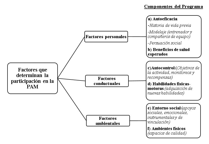 En los factores personales, los principales componentes que influyen en la participación al deporte son: la autoeficacia, la automotivación, los beneficios esperados, la actitud que la persona tiene hacia su salud, las características de la personalidad, el grado de compromiso con las actividades deportivas y la historia de vida previa, siendo este último factor, un buen predictor para el mantenimiento de un estilo de vida activo en la edad adulta (Bandura, 1986; Márquez, 2012; White, Wójcicki y McAuley, 2011). En el caso de los elementos conductuales, están determinados por dos constructos, el autocontrol, definido como la habilidad propia del comportamiento que permite alcanzar las metas y objetivos establecidos, y las habilidades físicas-motoras del individuo (Bandura, 1986; Márquez, 2012). Por último, los factores ambientales se establecen por aspectos propios de la práctica deportiva y del contexto en que se realizan las actividades; tales como: las relaciones del entorno social y el apoyo de los compañeros, los familiares o amigos (Young y Medic, 2011), y los aspectos relacionados con el espacio físico como el clima, los horarios y la distancia de las instalaciones donde se realizan los entrenamientos (Fisken, Keogh, Waters y Hing, 2015). Aunado a estos factores, Dunlop y Beauchamp (2013) y Hawley-Hague, et al. (2013), mencionan otros componentes inherentes a la participación deportiva que se relacionan con la pertenencia, en la práctica de cualquier deporte, como por ejemplo la dosificación de la intensidad del entrenamiento y la competencia.