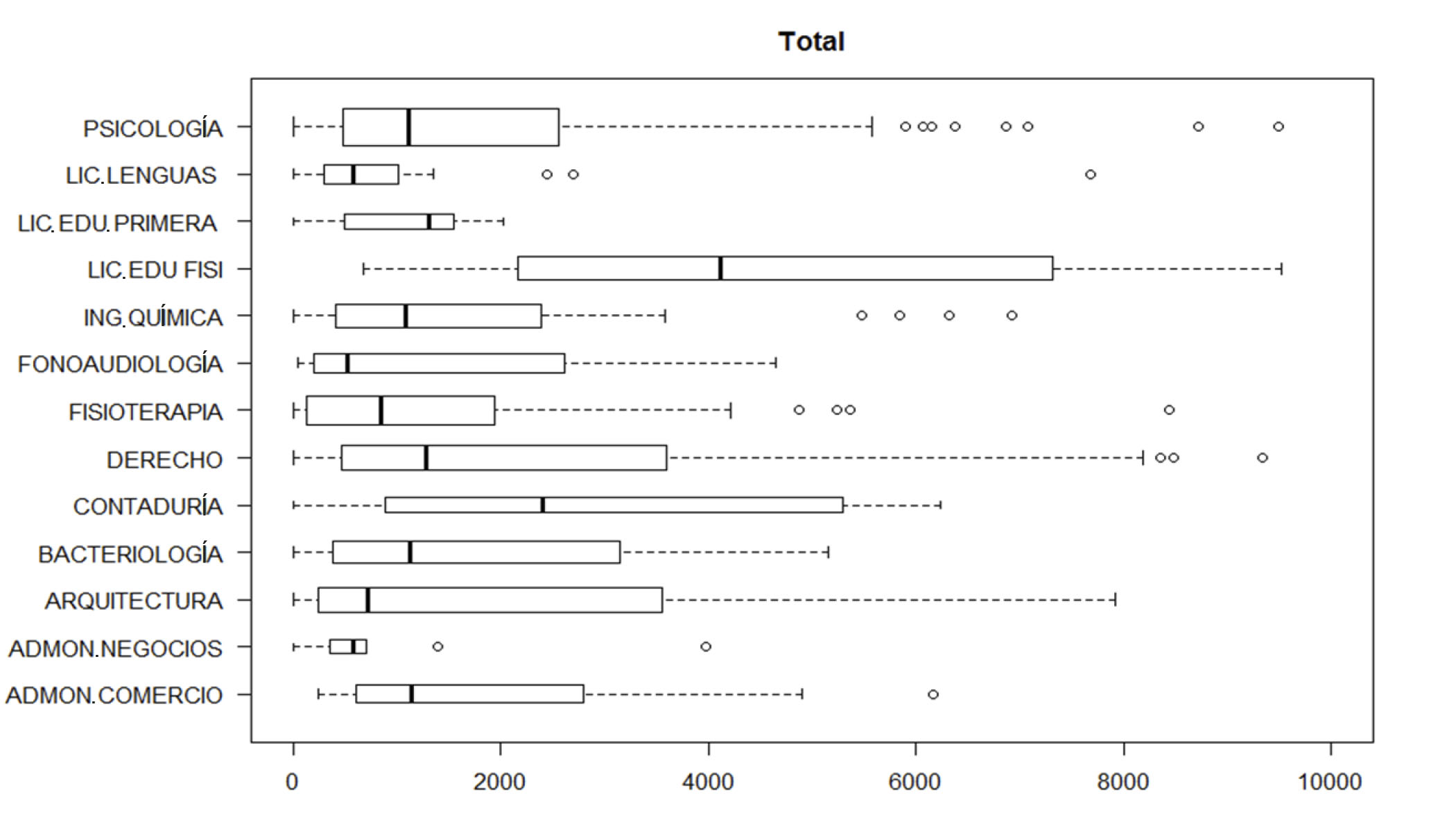 Puede observarse que la mediana de los pregrados de Licenciatura en Educación Física (4.111 MET-minuto/semana) y Contaduría Pública (2.407 MET minuto/semana) son más activos que para los demás pregrados. Los pregrados con mediana de gasto energético más bajos son Administración de Negocios (578 MET minuto/semana), Fonoaudiología (526 MET-minuto/semana) y Licenciatura en Lenguas (579 MET-minuto/semana). Considerándose como inactivos.