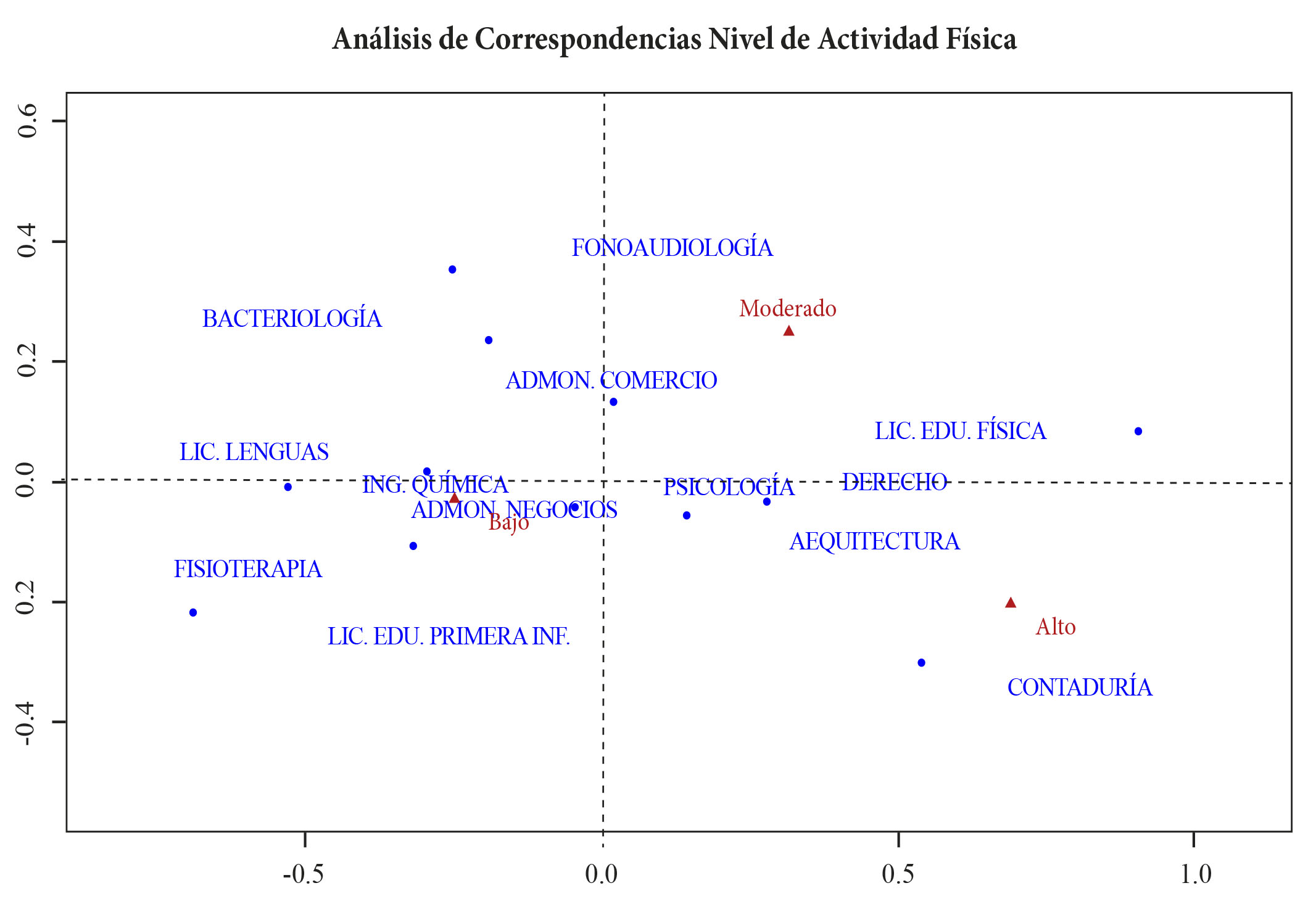 Por ejemplo, al nivel de actividad Alta se asocian los pregrados de Contaduría Pública y Licenciatura en Educación Física, en menor medida se asocian los programas de Arquitectura y Derecho; estos mismos programas se acercan más al nivel moderado que al bajo, por lo que claramente son los pregrados con mayor actividad física. Al nivel de actividad moderado se asocian en mayor medida los programas de Fonoaudiología y Administración de Comercio. Al lado izquierdo del plano se ubican los pregrados asociados con actividad física baja, entre ellos se encuentran Licenciatura para la primera infancia y Licenciatura en Lenguas, Ingeniería Química, Administración de Negocios y Fisioterapia. El pregrado en Psicología se encuentra casi igualmente distante a los 3 niveles de actividad, lo que indica que los estudiantes de este pregrado se dividen similarmente en las 3 categorías. Finalmente, la asociación entre el nivel de actividad física y el programa académico de pregrado arrojó un p-valor < 0,0001, esto permite decir que el nivel de actividad física depende del programa académico que curse el estudiante.