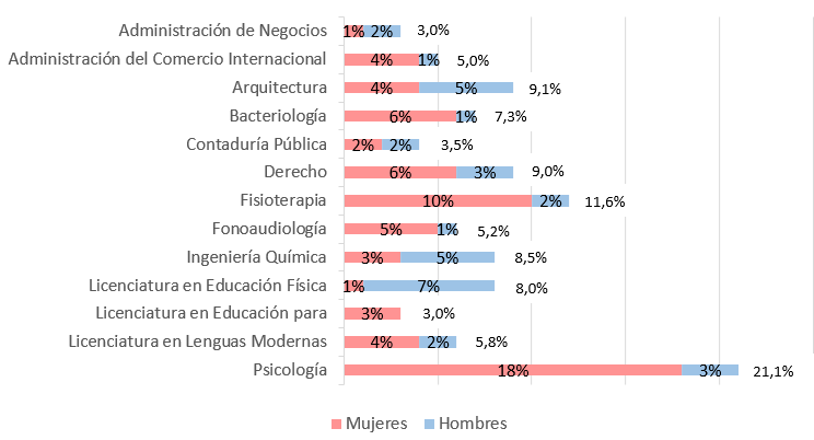 El rango de edad del estudiantado de la universidad se encuentra entre los 16 y 40 años, pero el 92 % tienen edades menores a 25 años. La edad promedio fue de 20 años, para las mujeres de 20.1 años y para los hombres de 20.2 años, el programa académico con el promedio de edad más bajo fue Administración de Negocios con 18.6 años, y particularmente, las mujeres con 17.8 años, el programa con el promedio de edad más alto fue Licenciatura en Educación para la Primera Infancia con 21,3 años. La mayor concentración de estudiantes se presenta en Psicología con una participación del 21.1 %, con el 87 % de mujeres; seguido de Fisioterapia con el 11.6 % de participación. En la mayoría de pregrados se presenta una participación mayor de mujeres que de hombres, a excepción de Administración de Negocios, Arquitectura, Ingeniería Química y Licenciatura en Educación Física, donde es mayor el número de hombres, ver Figura 1.