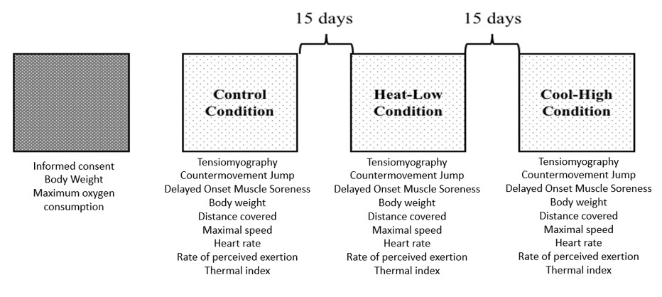 Environmental temperature: for the assessment of the WBGT thermal stress index, a heat stress monitor (QuestTemp 36, 3MTM) was used. The equipment was calibrated according to the manufacturer and placed on a tripod 50 m from the start of the 30´ TT track.
