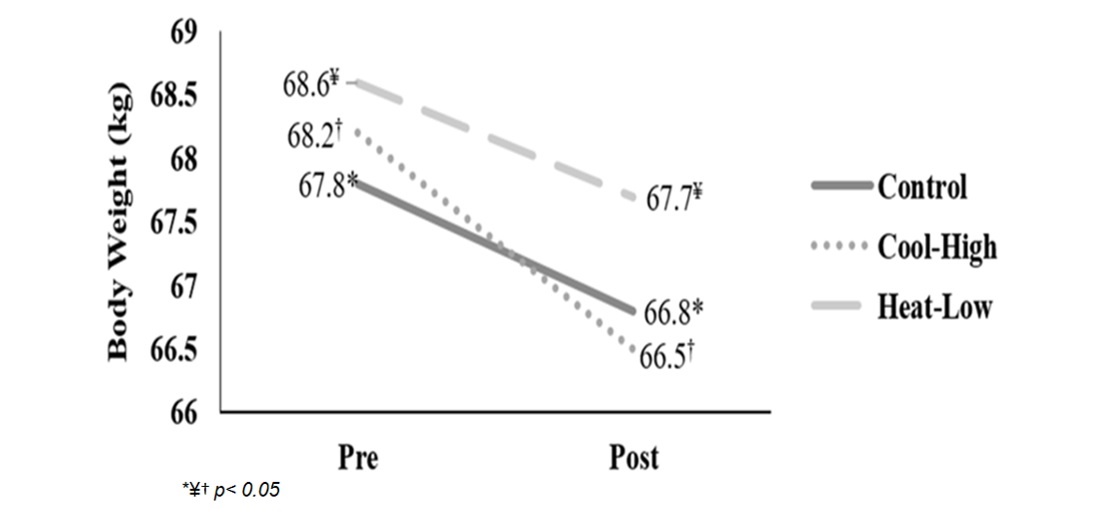 Figure 2 shows significant interaction in body weight (F(2,57): 4.762, p=0.012, ωp2=0.11). After main effect analysis, there was a significant difference between measurement moments (F(2,57): 625.9, p<0.01, ωp2=0.95). Body weight decreased significantly after the running in each condition: Control (F(2,57): 260.4, p<0.01), Cool-High (F(2,57): 143.6, p<0.01) and Heat-Low (F(2,57):231.6, p<0.01). No differences between conditions were found (F(2,57): 0.049, p=0.952).